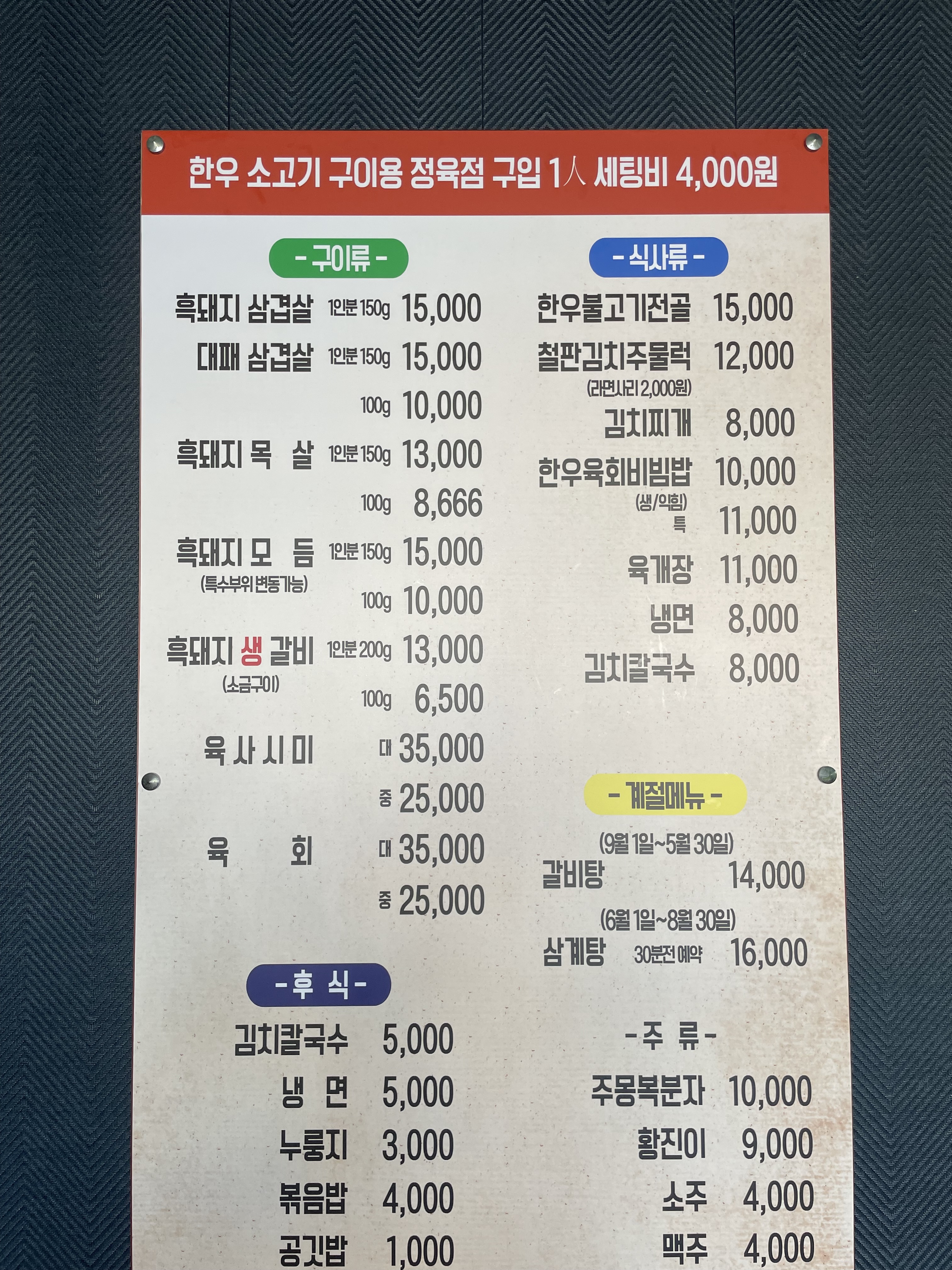 - 흑돼지특수부위1인분 15,000원