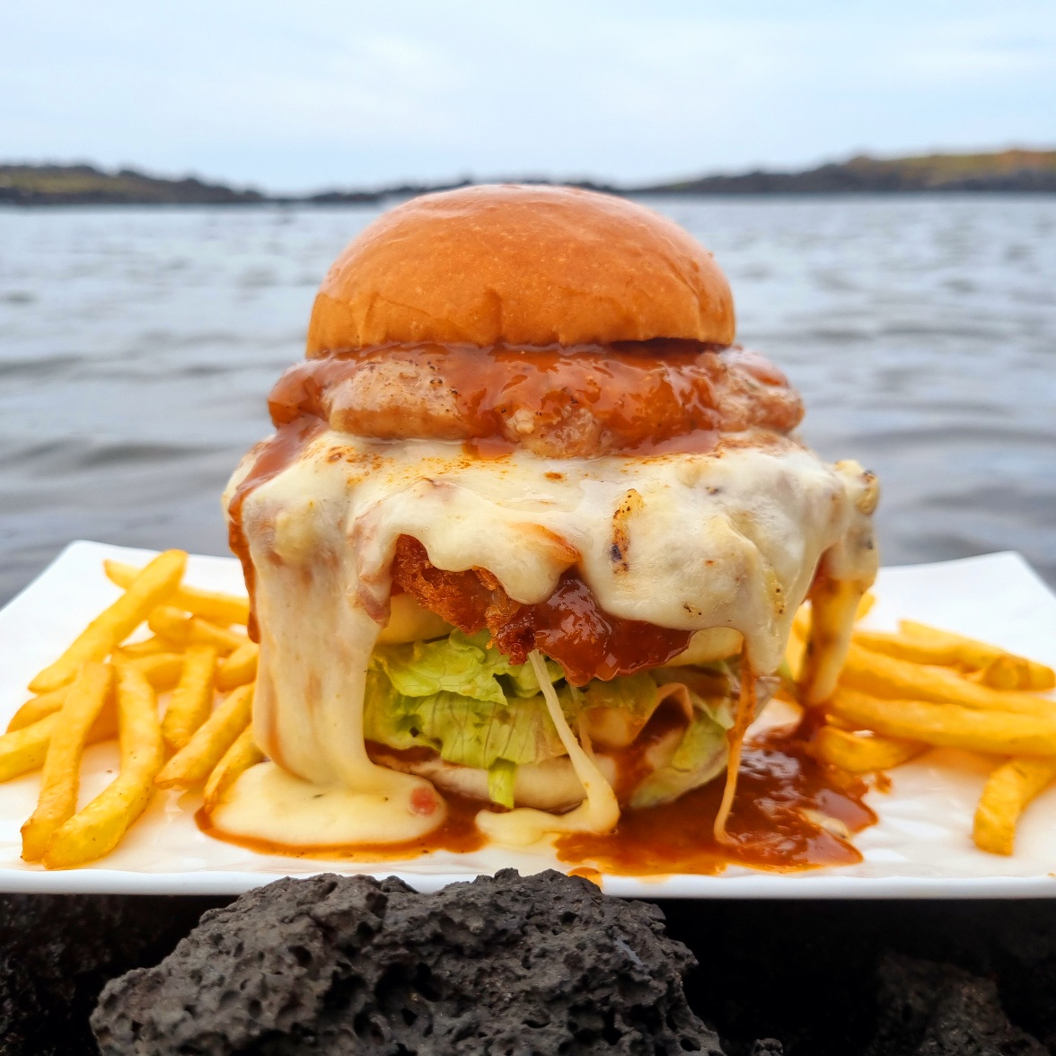 맑음8856아침식사로 대왕고기해물짬뽕과 수제 모짜렐라치즈돈까스버거 먹었어요 ㅎㅎ 버거는 사진남길틈없이 아들이 폭풍흡입했어요ᆢ해물 킬러라서 아들이 다먹었어요 ᆢ살짝 매콤하면서 양은 엄청많았지만 너무 맛있다고 혼자 두가지 거의 먹었어요 맛있게 잘 먹었다고 점심은 그냥 패스하겠다고네요 ᆢ 인테리어도 아기자기하게 잘 해놓아서 힐링되었어요ᆢ 다음에 시간내서 또 가야할 우도맛집이예요