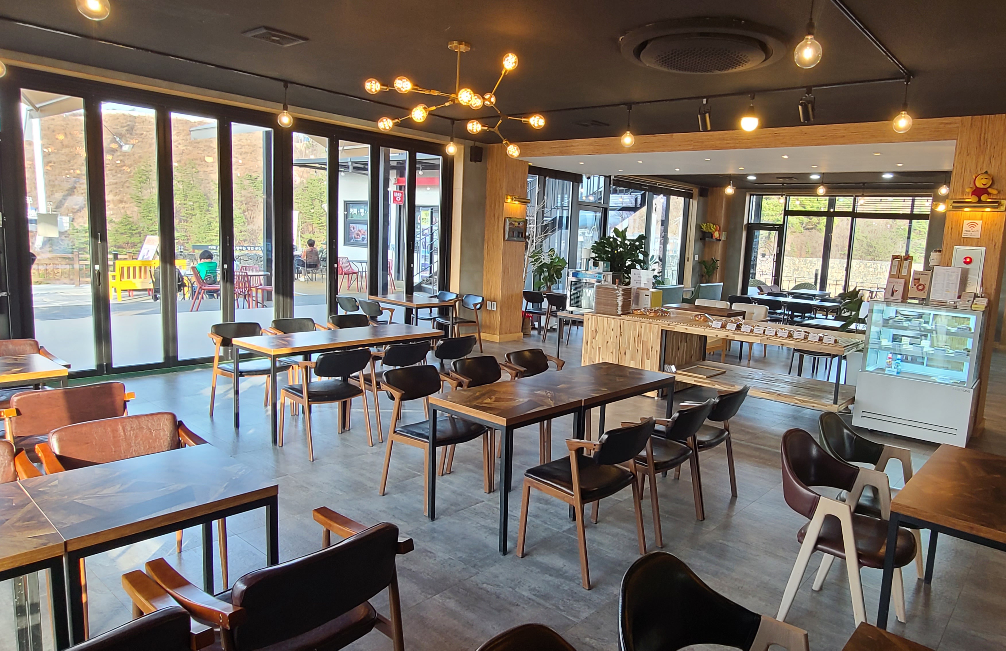 캔디머신철원 나들이중 전망 좋은 카페 찾아서 방문했어요. 1, 2층 모두 시원한 통창이라 은하수교 뷰를 즐기기 좋고 내부도 넓고 깔끔합니다. 동절기 횃불전망대는 17시 까지라 못 올라갔지만 바로 아래 가파른 경사길 까지 걸어 올라 전망 구경 할 수 있어서 좋았어요.