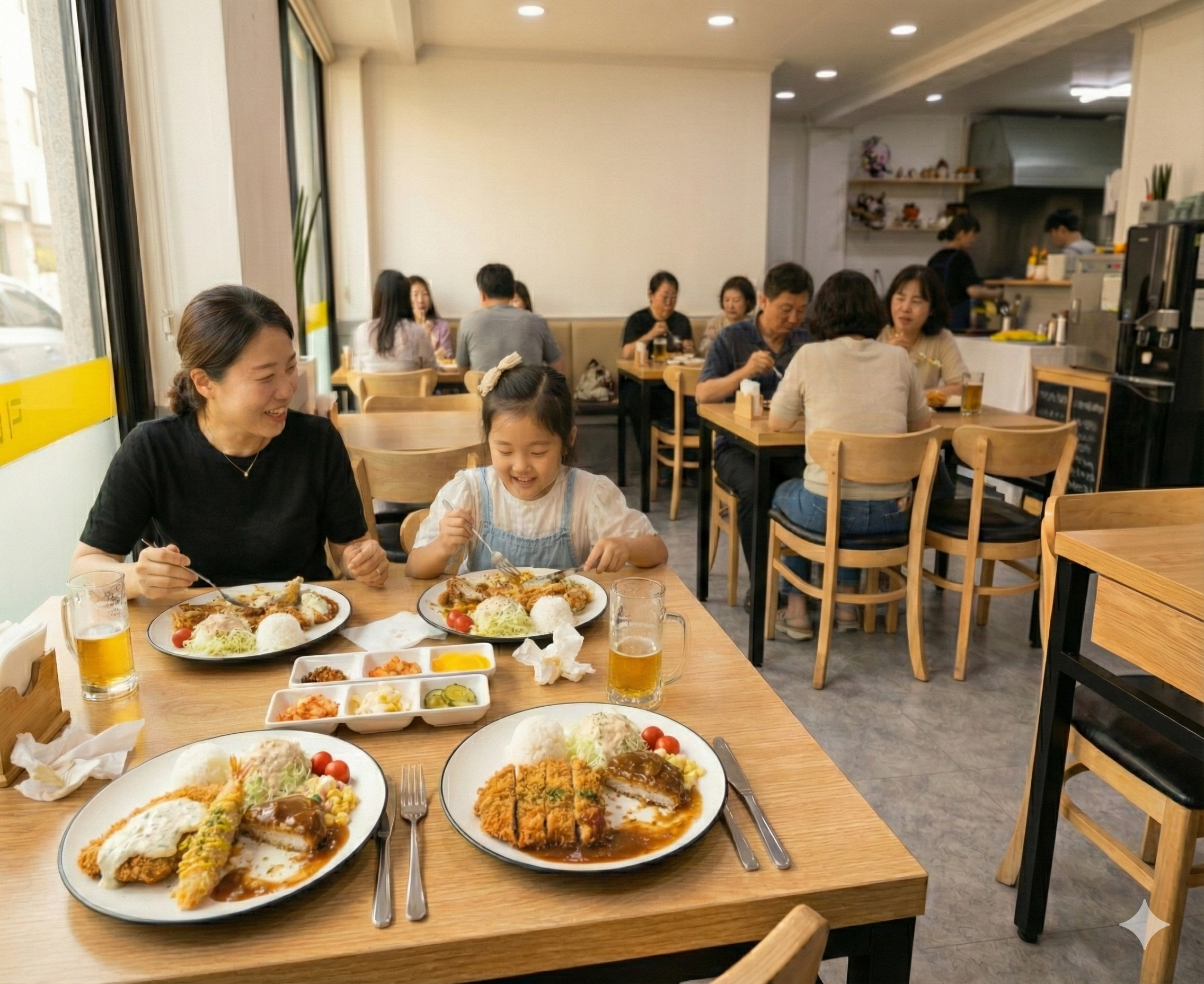 쑤우80둔내 여행와서 남편과 아이와 함끼 맛있는 한 끼 했어요! 남편은 매운 돈까스, 저는 점심정식(미니돈까스&생선까스) 주문했는데 와~ 양도 많고 푸짐하고 거기에 셀프파는 상큼한 과일과 샐러드가 있어서 궁합이 참 좋아요!!