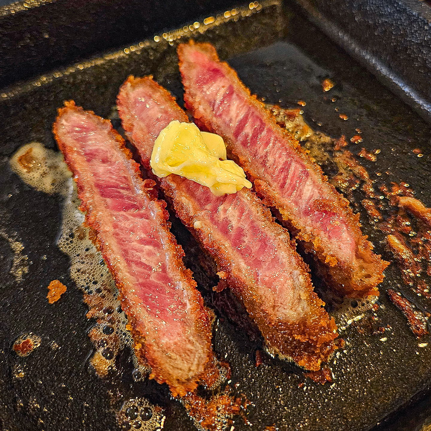 서현8772규카츠 채끝살로 시켰구 이즈니가 버터 나와요~~ 이즈니 버터랑 같이 구워서 고소하구 부드럽고 엄청 맛있었어요!!😋 그리고 밥 리플 된다고 해요! 전날에 네이버로 예약하구 알림받기해서 가라아게도 먹었는데 이것두 맛있었어욤