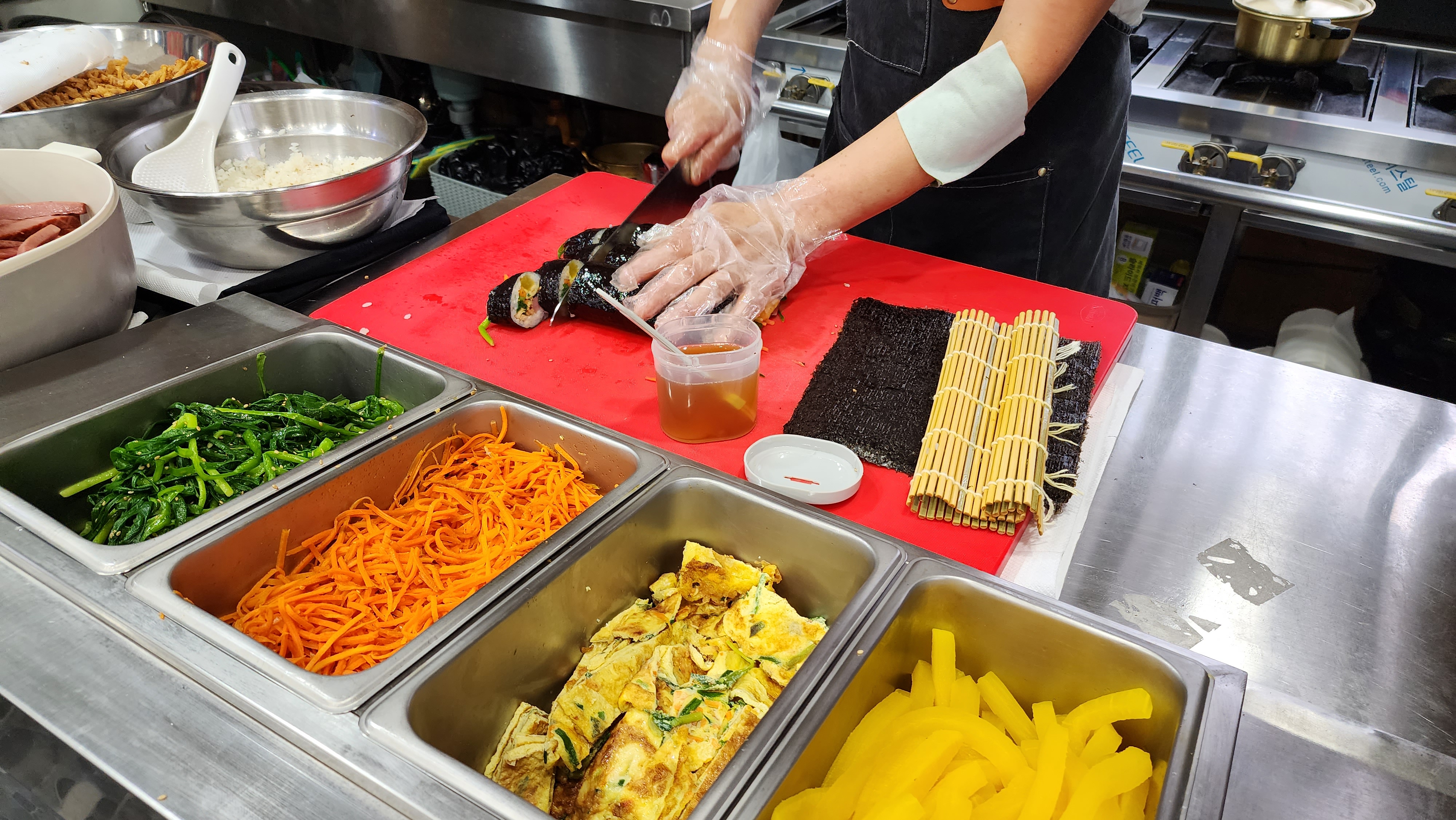 김 Agnes맛있어요.근데 저는 유부튀김인가 바사삭 하는 김밥 속에 느끼하고 그냥그래요 라면도 본연의 라면맛은 안나네요 남편은 김밥은 독특하고 맛있다니 다행이지요 유명세만큼 제입엔 쏘쏘 그러나 뜨거운 계피 차는 최곱니다 식당 들어가자마자 계피 향이 너무좋습니다