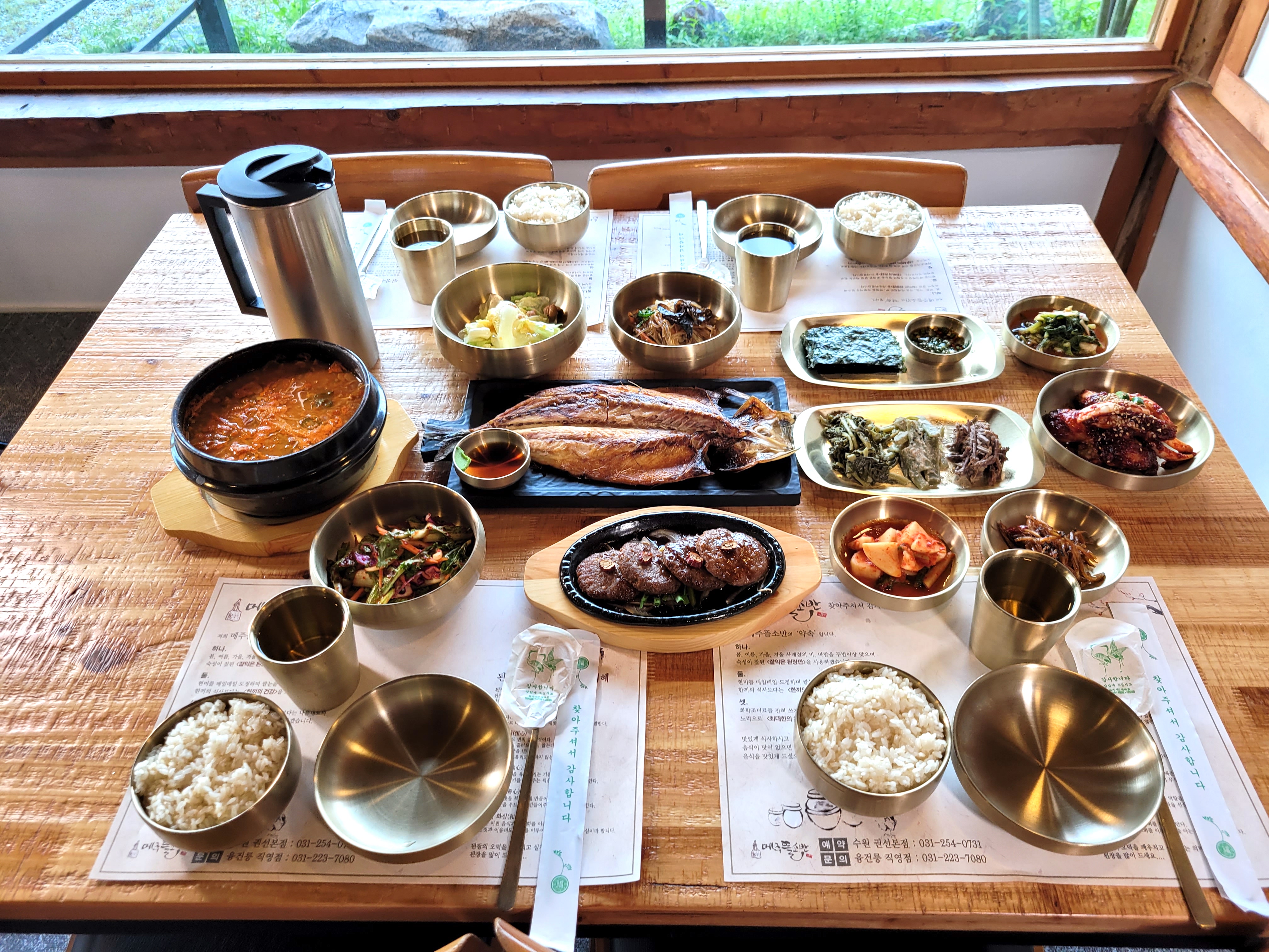 makalong오늘은 화성 융건릉 한정식 맛집 메주뜰소반 포스팅입니다. 원래는 청학동칡냉면을 먹으려고 했는데 최근 너무 매운음식을 먹으면 속이 좋지 않아서 찾아보던중 오늘 소개하는 식당이 보이더라구요. 메주뜰소반은 한식집인데 식객 허영만 선생의 백반기행에도 출연했다고 하죠. 원래 이 식당은 협찬도 많이 하는 식당인데 전 신청안했습니다. 협찬하면 제대로 맛을 못보겠더라구요. 사진찍느라 그리고 코로 들어가는지 입으로 들어가는지 정신이 없어요. 오늘은 메주뜰소반의 메인 메뉴 메주뜰소반정식(1인 22,000원)을 주문했습니다. 청국장, 고등어구이, 수육, 양념꽃게장, 잡채 등이 메인인데요. 청국장은 간이 순하고 구수하네요. 전반적으로 조미료의 강한 감칠맛은 느껴지지 않아서 건강한 느낌인데요. 그래서 그런지 강한 임팩트는 없습니다. 오늘도 옆테이블의 어떤 분.. 정말 30분 내내 떠들더라구요. 자리를 옮기려다가 마땅한 자리가 없어서 그냥 먹었는데 제발 먹을떄는 조용합시다. 다음에는 스캔해서 시끄러우면 그냥 다른 식당에 가는게 좋을 것 같더라구요. 특히 주파수가 높은 목소리가 있어요. 노이즈로 들리지요. 고등어구이도 짜지 않고 슴슴한 편이구요. 수육은 잡내 없이 깔끔하네요. 양념꽃게장도 아주 달지 않아요. 잡채는 좀 식어 있네요. 밥은 현미를 매일 도정하고요. 50% 쌀눈을 살려서 맛과 건강을 다 잡았다고 합니다. 정식외에 청국장 단품과 된장찌개 단품도 있고요. 불고기 전골, 소갈비찜, 떡갈비도 있습니다. 정식2개와 떡갈비를 주문하시는 분들도 꽤 많네요. 강민주의들밥과 비교를 하자면 강민주의들밥은 고기도 없고 생선도 없지만 나물의 간이 아주 잘 맞아요. 여기보다 조금 더 간이 세다고나 할까요. 요약 노트 화성 융건릉 한정식 맛집 메주뜰소반 주소 : 경기 화성시 세자로 461 영업시간 : 10:30 ~21:00 전화번호 : 031-223-7080 특징 ▶화성시 융건릉 한정식 맛집 화성 융건릉 한정식 맛집 메주뜰소반입니다. 입구가 꽤 올드해 보이네요 허영만 선생의 백반기행에 출연 가수 영탁과 같이 출연했지요 갓도정한 쌀을 사용한다지요 메뉴 감상 1인분 주문가능한 메뉴 내부는 초가집 컨셉 조명도 잔잔하고 은은하네요 뭔가 막걸리가 땡기는 분위기 테이블 세팅지 위생적으로 수저에 포장이 되어 있습니다. 구수한 청국장 등장 매콤 새콤한 겉절이 잡채는 꽤 식어 있네요 샐러드와 우엉조림 적당히 잘 익은 깍두기와 열무김치 마른김과 간장도 나오고 잘 구운 고등어 양념게장은 그닥 많이 나오지 않네요. 3인 66...