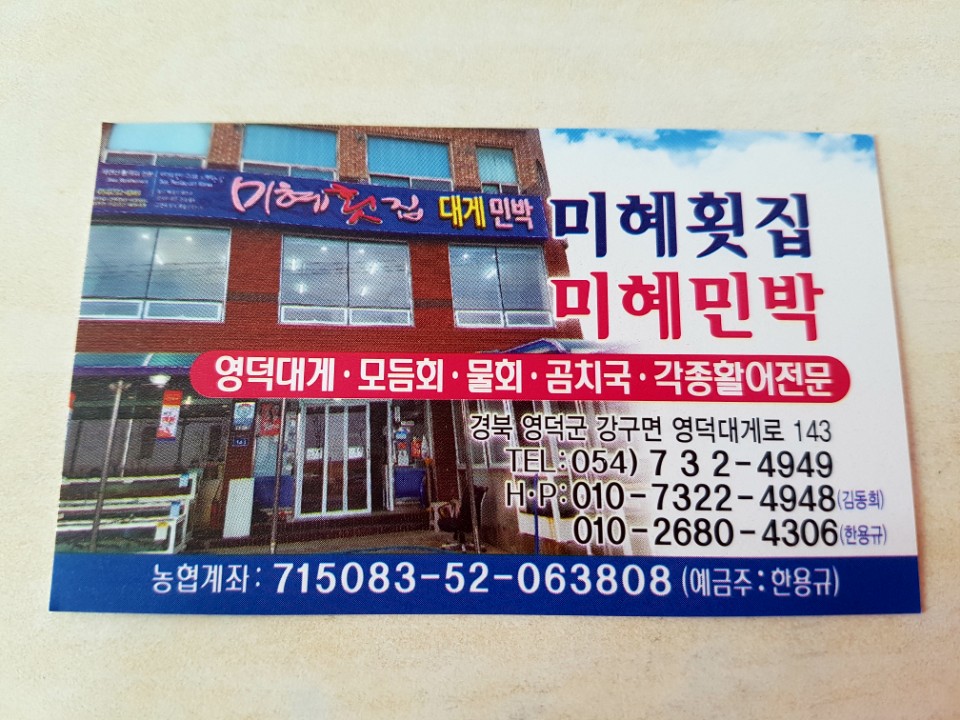 먹순이벨라오징어물회가 유명하대서 주문 고추장에 물을 살짝 섞어서 김에 싸먹는 현지인 물회집이에요 쥔장님이 혼자하시는듯하여 음식나오는 시간이 아주쬐끔 걸리긴하지만 엄청 친절하시고 맛도 좋았어요 다른 물회집은 살얼음에 새콤 달콤한 시원한 맛이지만 여기 미혜물회는 달콤하고 걸쭉한 느낌의 가게입니당 한번 맛보시는것도 좋을거같아용