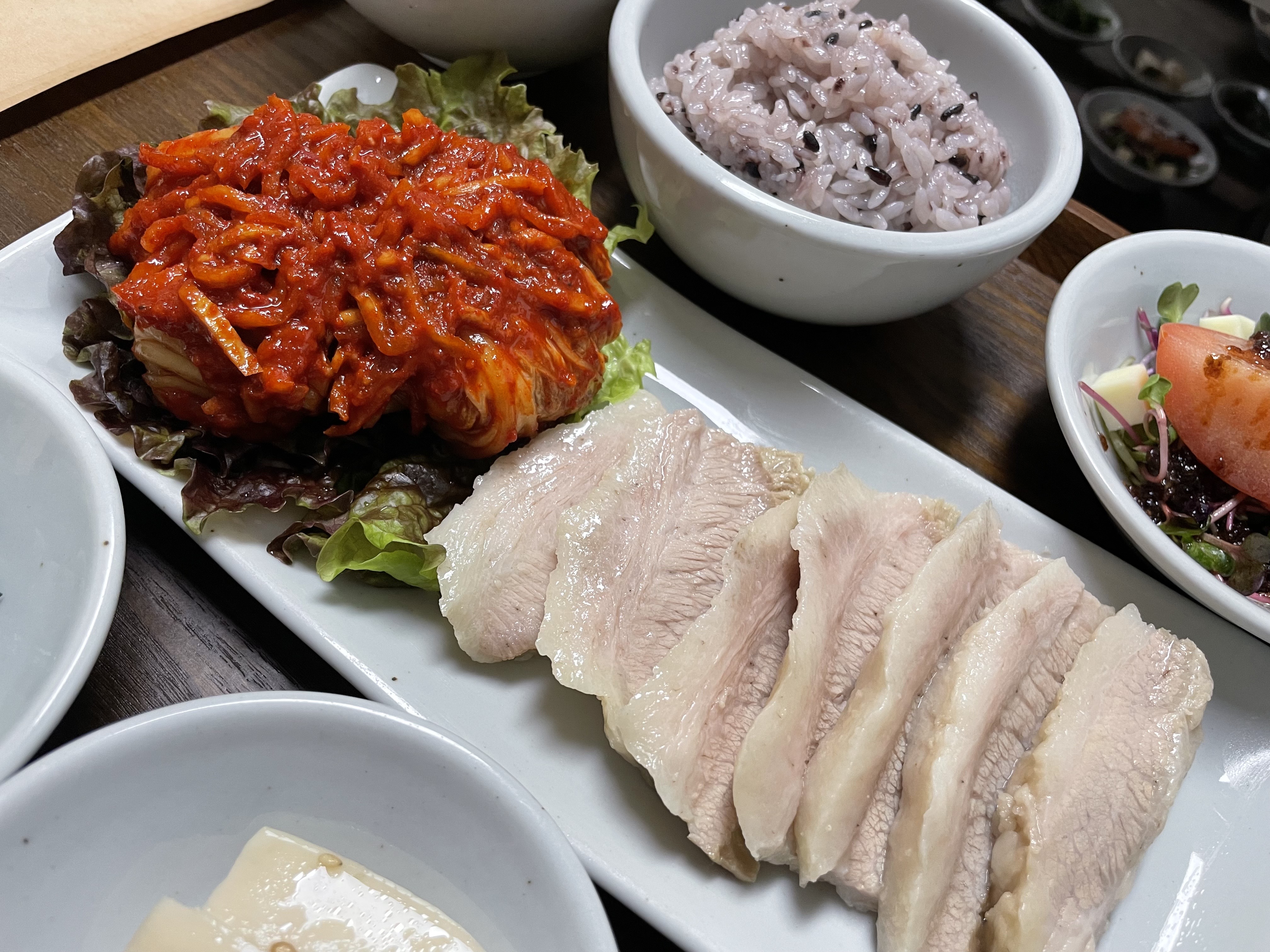 수육보쌈이 고기가 크고 맛있습니다~고민하다 시켰는데 고민할 필요없습니다~ 밥은 솥밥을 인분에 따라 나눠먹습니다~솥밥도 맛나요~1인정식가격치곤 쪼끔 부담스러울수 있지만 맛은 괜찮습니다~