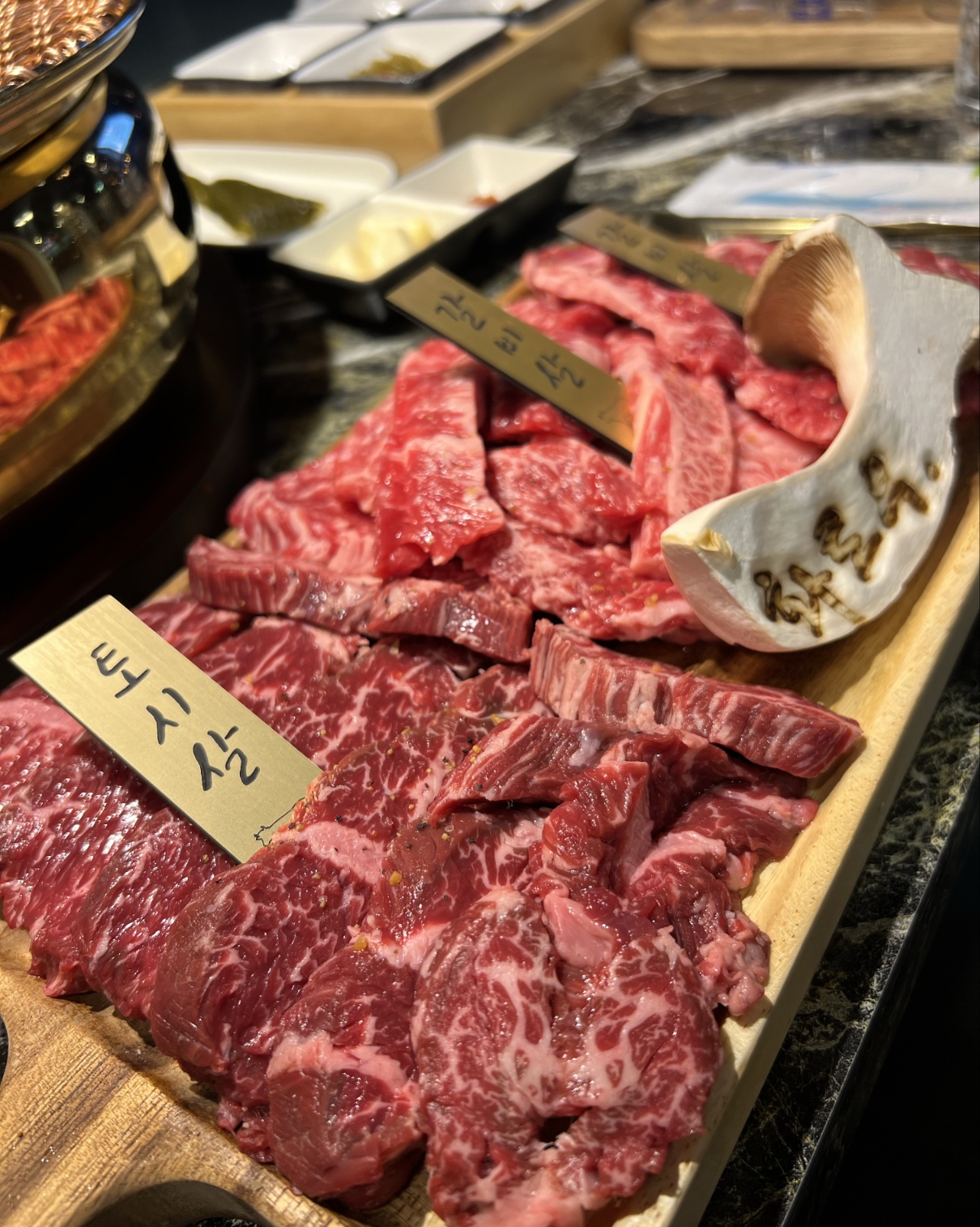 마에다리쿠띠비소고기가 신선하고 연하고 부드러워요. 육즙이 많이 나와요. 김치가 맛있어요. 밑반찬이랑 소스가 많아서 좋아요. 다양한 소스를 찍어 먹을 수 있어서 좋아요. 홀그레인 머스터드가 정말 맛있네요. 상이 넓어서 편해요.