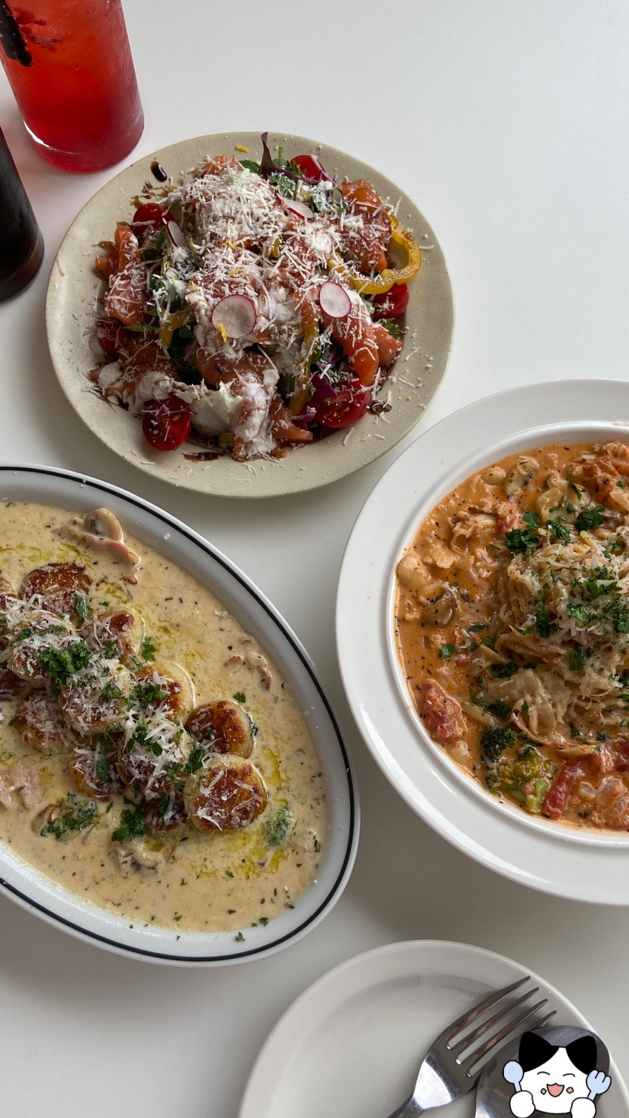 hrs****트러플 크림 뇨끼가 너무 맛있어용🥰 뇨끼 자체도 겉바속촉하니 맛있고 크림 소스도 넘 맛있어서 밥 말아먹고 싶어용 명란오일 파스타도 매콤 깔끔하니 맛있구, 연어 샐러드가 킥이었어용! 생각보다 연어가 크고 도톰하고 많이 들어있었답니당😋 통창이라 밝고 분위기도 좋아용👍🏻