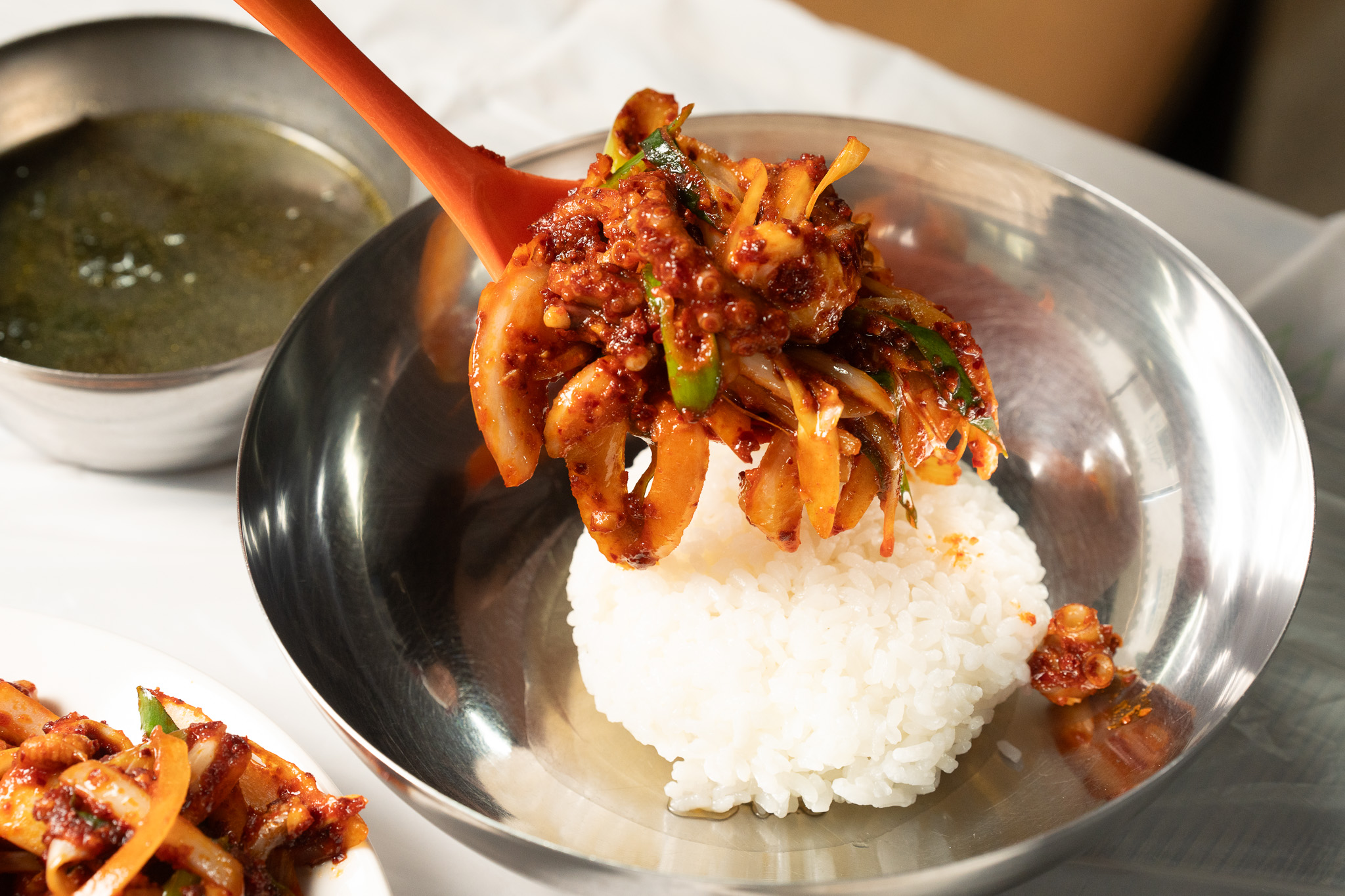 K아리냄새부터 침샘을 자극하더니 완전 취저 당했습니다. 산낙지 볶음 맛나다고 해서 찾아갔는데 지금 딱 철에만 먹을 수 있는 돌문어 볶음 추천 받고 주문했는데 완전 쫄깃하고 부드럽고 불향 제대로!!! 신라면 맵기 밖에 못 먹는데 딱 맵기 좋았구요. 살짝만 넣어서 비벼 먹으면 아이들도 먹을 수 있을 것 같습니다. 살아있는 문어의 싱싱함과 쫄깃함 그리고 비법 양념!!! 무조건 드셔보세요. 절대 후회 안하실꺼에요~ 내일 집에 돌아갈때 가져가려고 포장 예약도 했어요!!!