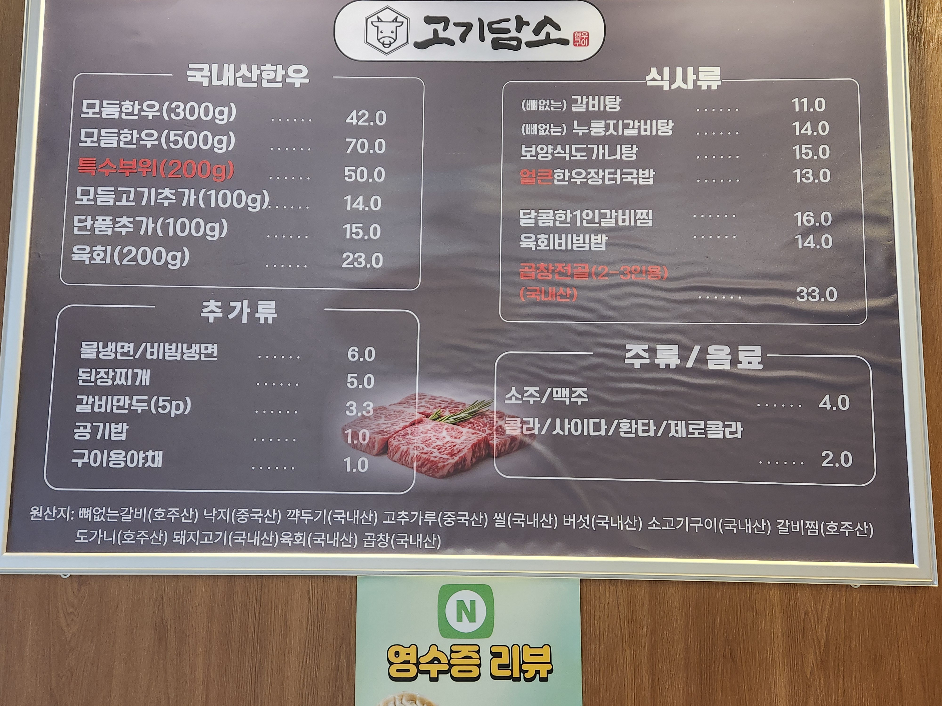 - 한우구이(500g) 70,000원