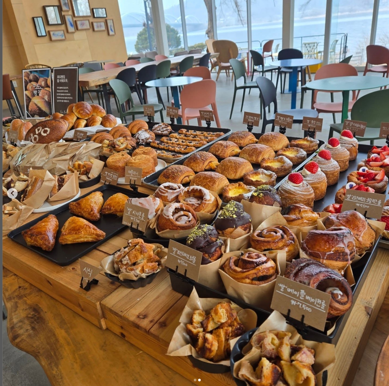 rosera날이 흐려 걱정했는데 너무 좋네요 💕이제 봄인데 야외에서 디저트랑 빵먹으면 힐링될거같아요. 피크닉 느낌도나고 산책도 할 수있어요. 가게 층고도 높고 통창이라 뷰 개방감도 좋고 힐링이에요. 또 올것같아요😊👍