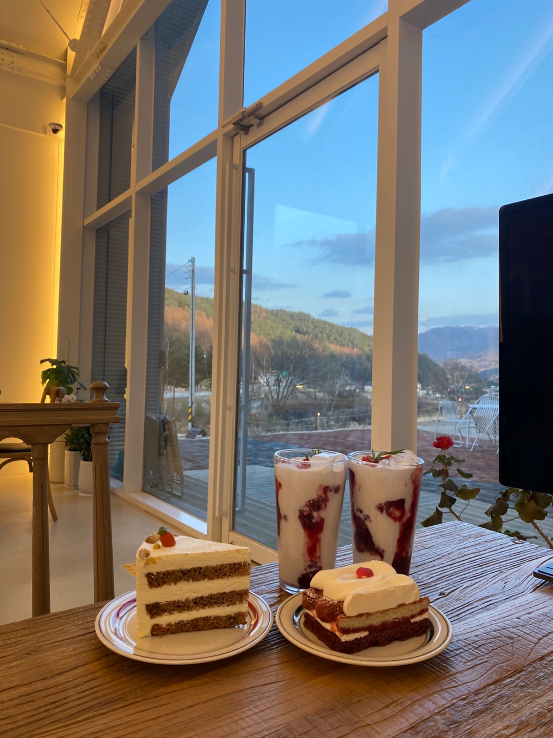 맛간다람쥐a큰 삼각구조의 깔끔하면서 아늑한 내부 공간으로 통창을 통해 자연뷰를 훤히 바라볼 수 있으며 왼편에는 글램핑장으로 같이 운영되는 것 같아요! ㅎㅎ 크리스마트리와 아기자기한 눈사람 인형으로 인생사진찍기도 좋고 음료도 맛있고 혼자쉬기 부담없이 편하고 좋았어요 :)