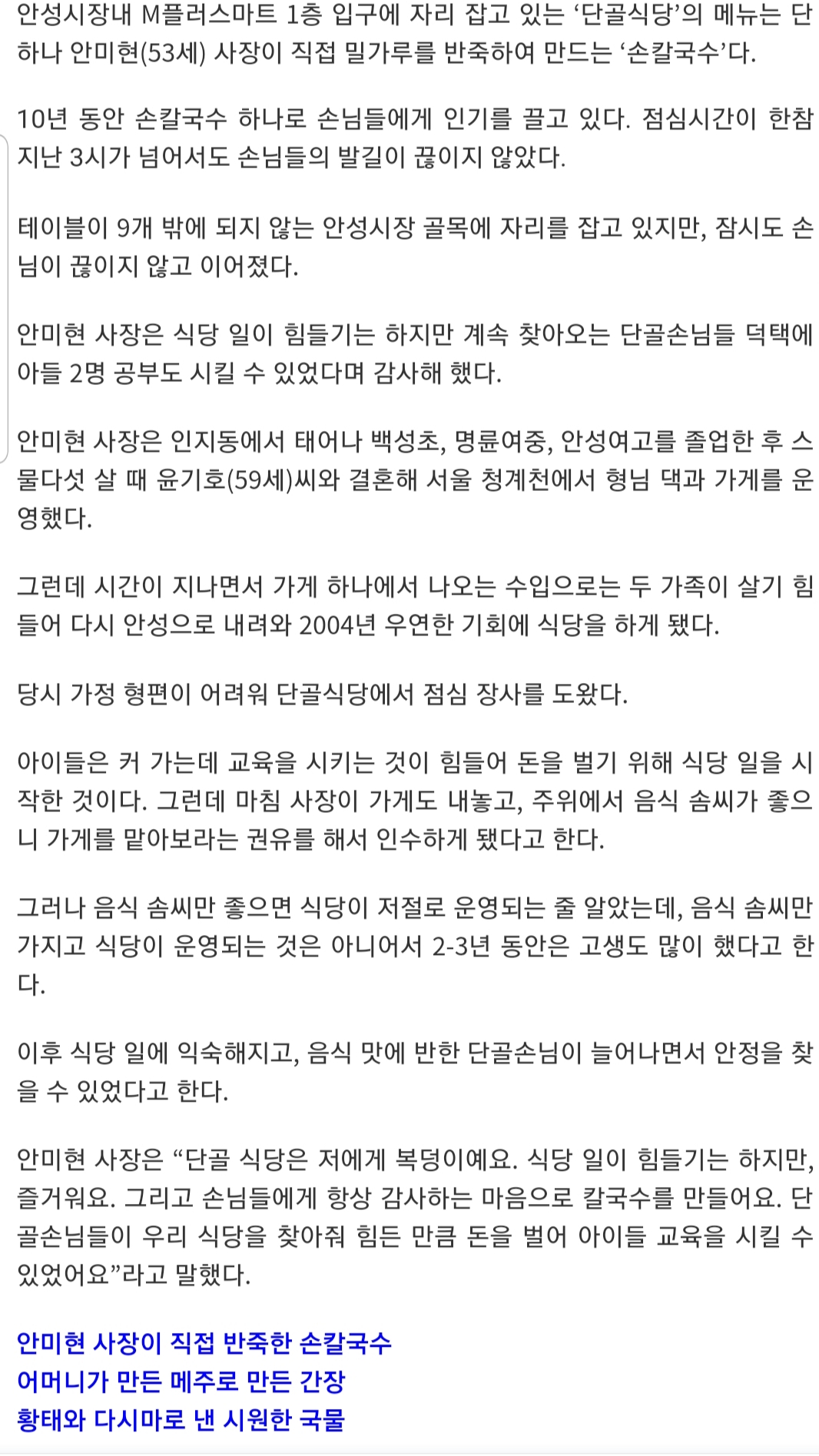ㅇㅎㄴㄱㄱ많이 변했네요 안성토박이 어렸을때부터 단골인데요 오늘 면 안익었는데 그냥 그러려니 바쁘셔서 그렇겠지 하고 먹었는데 면에 머리카락이 박혀있더라구요 아저씨한테 말씀드렸더니 사과한마디 안하시고 다시해준다고 가져가시고 새로한거 툭 던져놓듯이 놓고 쌩 가버리시네요 진짜 단골식당.. 단골잃으셨네요 그만가려고요