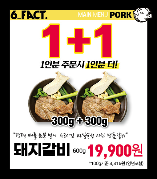 - 48시숙성 돼지갈비 (1+1) 2인분 19,900원