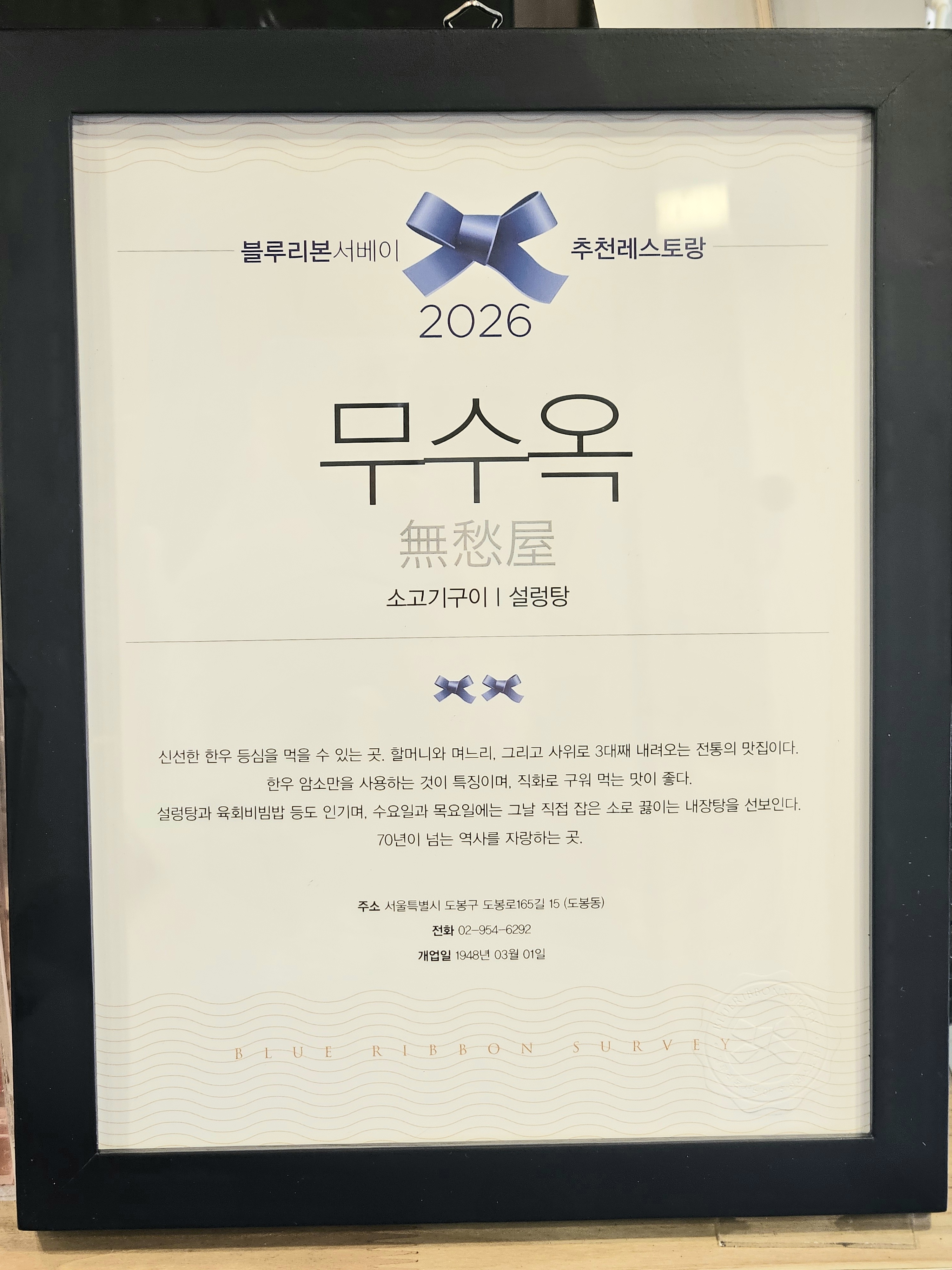 wepawn도봉구 쪽에서 정말 오래된 집 하나 다녀왔다. 무수옥. since 1948. 도봉구 맛집 이야기할 때 빠지지 않는 이유가 분명한 곳이다. 요즘 새로 생기는 식당도 많지만, 이렇게 조용히 자기 자리를 지켜온 집은 확실히 다르다. 괜히 도봉구 노포, 도봉구 맛집으로 불리는 게 아니다. 기록이 말해주는 집 입구에 들어서자마자 보이는 블루리본 기록들. 한두 해 받은 게 아니라 수년간 꾸준히 이어진 흔적이라 더 신뢰가 간다. 오래된 집이지만 여전히 현재형이라는 느낌이 든다. 육회비빔밥부터 보면 육회는 양념이 과하지 않다. 고기 자체로 승부하는 스타일이다. 양파와 채소 위에 올린 육회에 참기름과 깨는 꼭 필요한 만큼만 들어가 있다. 첫 입 먹자마자 기본이 탄탄한 집이라는 게 느껴진다. 도봉구에서 이런 육회 내는 집은 흔하지 않다. 이 집의 중심, 설렁탕 무수옥을 이야기하면 결국 설렁탕이다. 국물은 진하지만 부담스럽지 않고, 기름이 둥둥 뜨는 스타일도 아니다. 맑으면서도 깊고, 먹고 나면 속이 편안하다. 파를 넉넉히 넣고 후추만 살짝 뿌려도 충분하다. 소금은 거의 손대지 않아도 된다. 도봉구 맛집 중에서도 다 먹고 나서 몸이 편한 집이라는 표현이 잘 어울린다. 메뉴판이 주는 신뢰 메뉴는 단출하다. 설렁탕, 육회비빔밥, 수육, 육회. 이것만 오랫동안 제대로 해왔다는 느낌이 분명하다. 괜히 메뉴를 늘리지 않은 점이 오히려 신뢰로 다가온다. 가격도 요즘 물가를 생각하면 정직하게 느껴진다. 총평 도봉구 노포 맛집으로 손에 꼽을 만한 집이다. 유행을 타지 않고, 말보다 음식으로 증명하는 스타일이다. 먹고 나서 “잘 먹었다”는 말이 자연스럽게 나오는 곳이다. 도봉구에서 설렁탕이나 육회가 생각날 때, 괜히 고민하지 않고 찾게 되는 집이 바로 이런 곳이다.