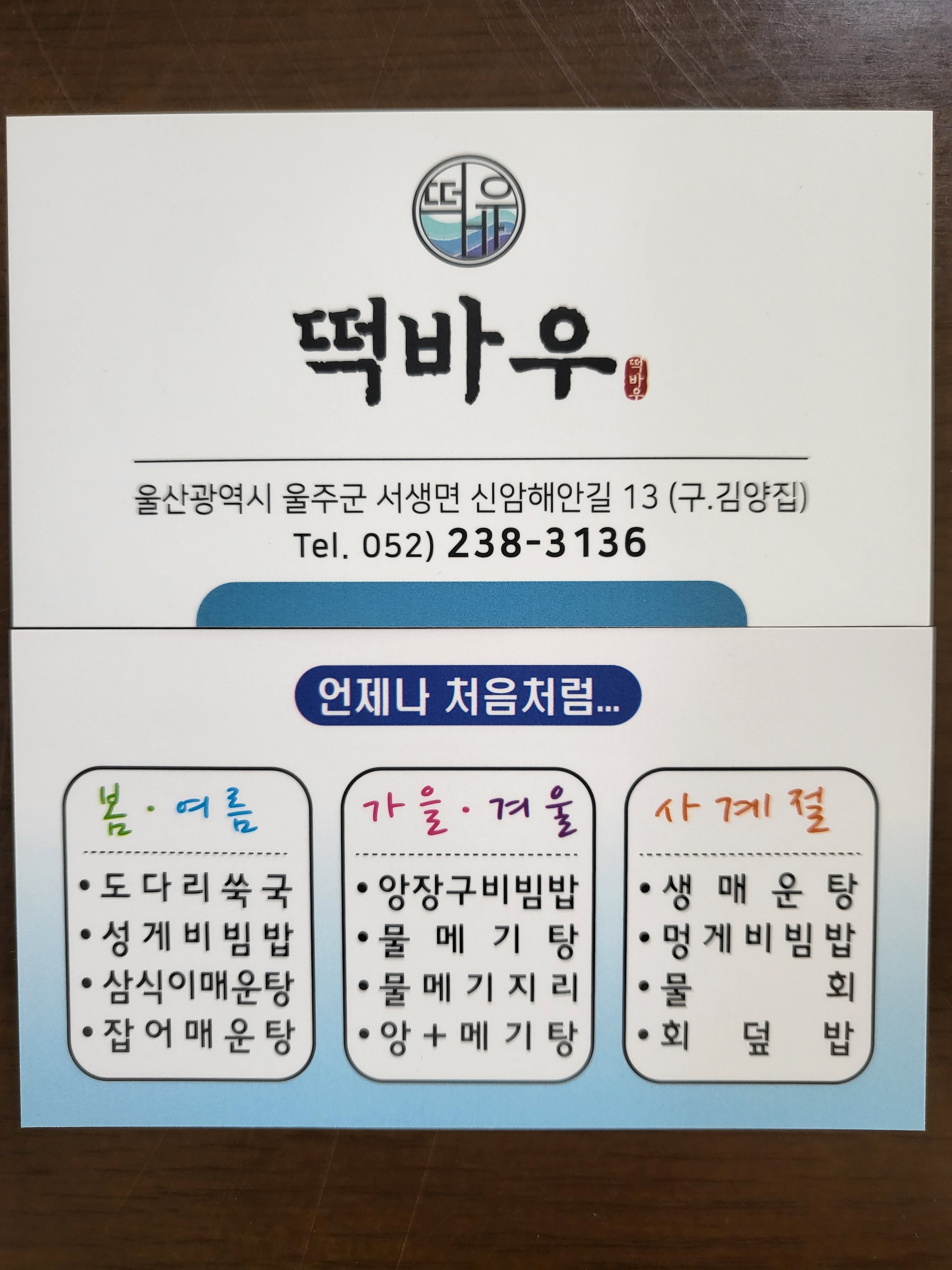 초록안녕하세요 간절곶에서 이전하여 울산 울주군에 위치하는 가성비 맛 모두 좋은 떡바우횟집 서생 하나로 마트 네비로 찍고 해안도로로 내려오면 울산 떡바우횟집입니다 울산 울주군 서생면 신암해안길 13 2층 매일 11시 20분~20시 30분 브레이크타임 15시 30분~16시 30분 주말은 브레이크타임x 라스트오더 19시 30분 전화번호 052-238-3136 주차가능 울산 떡바우횟집은 오전 11시 20분부터 오픈인데 대부분 일찍 와서 웨이팅을 합니다 울산 떡바우횟집은 가성비가 너무 좋은 횟집 생활의 달인에 성게비빔밥으로 출연했어요 울산 가성비 좋은 횟집 저는 물회를 먹으러 왔어요 떡바우횟집은 2층에 위치해서 건물 안으로 올라와서 가게 안에 있는 웨이팅 기계에 등록해야합니다 테이블링 웨이팅 어플로 원격줄서기 가능!! 주말에는 브레이크타임 없이 운영 됩니다 유명한 울산 횟집 떡바우횟집 여러 유명인들 사인도 있네요 울산 오션뷰 횟집입니다 바로 앞에 해안도로가 있어서 뷰는 엄청 좋아요 저희는 물회 2인을 주문했어요 1인 물회 18,000원 울산 떡바우횟집 가성비 좋은 횟집인 이유 물회 1인을 주문했는데 정말 푸짐하게 나와요 갈치구이, 맑은생선탕이 기본 반찬으로 나오는게 실화인가요??? 국에도 생선 살 정말 큼직하게 들어있어서 갈치구이와 국으로만 밥 1공기 추가 가능..!!! 보통 횟집에서 물회 시키면 기본적인 반찬류 3~4가지가 끝인데... 떡바우횟집 왜이리 추천하는지 알 것 같음 물회도 양 많고 회도 꽤 들어있었어요 떡바우횟집 왜 웨이팅맛집인지 알 것 같습니다 맛있는 물회에 밥 말아먹기 성공 #울산웨이팅맛집 #울산테이블링맛집 #울산물회맛집 #울산갈치구이맛집 #울산떡바우횟집 #떡바우횟집웨이팅 #떡바우횟집물회 #울산오션뷰횟집 #울산동네주민맛집