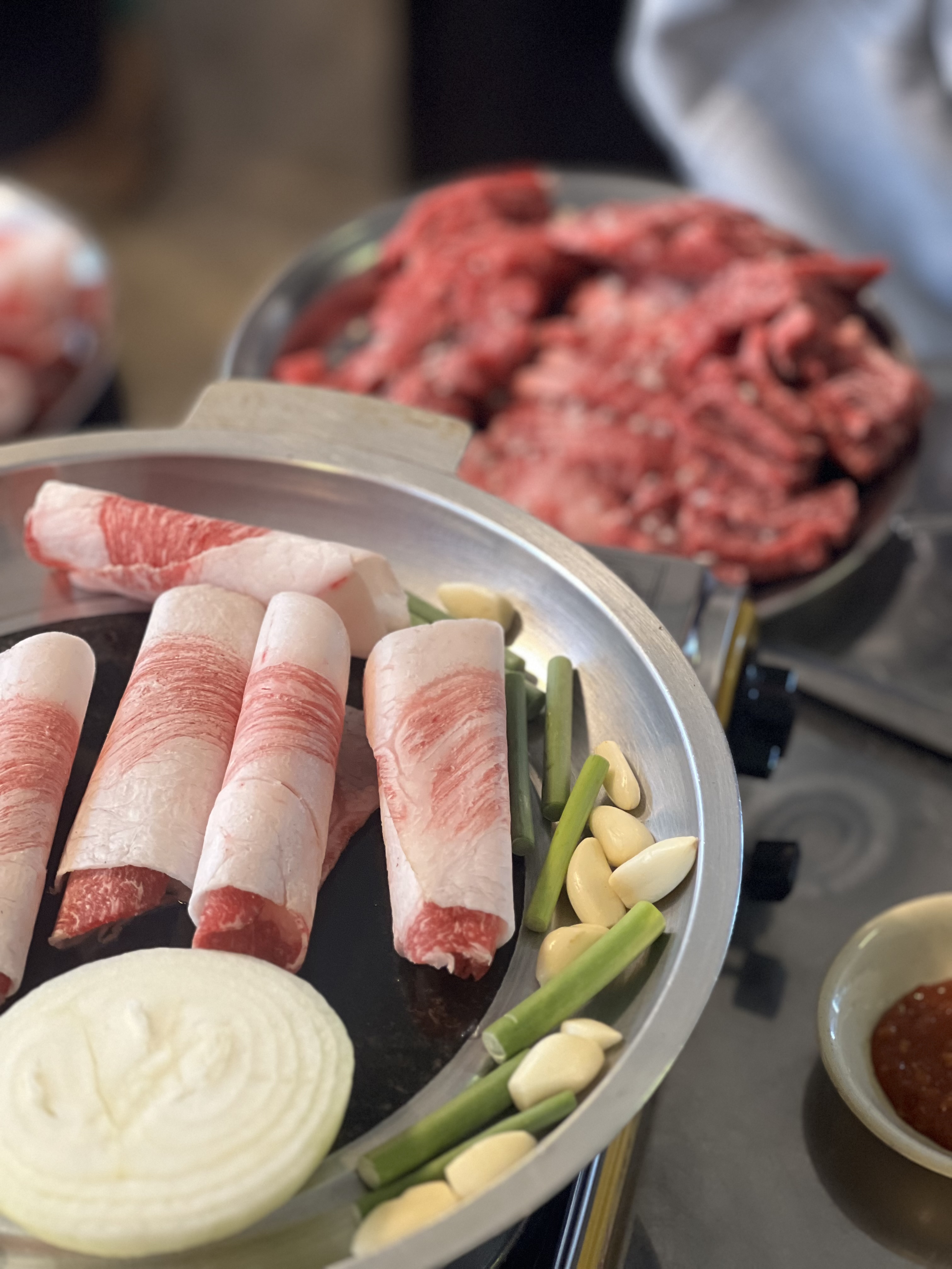 kyurindate방이동 고기집 초원소금구이에 다녀왔습니당😍 먹자골목 안쪽 빨간 간판 찾기 쉬운 삼합 전문점으로 오후 4시~자정(금토 새벽1시) 영업이에요. 넓은 실내 단체회식 딱 좋고, 2인 삼합 주문했는데 100% 한우 차돌박이·업진·치마·제비추리·부채살에 관자+묵은지 조합이 진짜 레전드🤤 불판에 양파·마늘·쪽파 깔고 기름장·소금·고추장 소스와 함께 구우니 차돌 살살 녹고 제비추리 쫄깃, 부채살 고소함 폭발! 초원삼총사(고기+관자+묵은지) 간장소스 찍어 싸 먹는 맛은 잊을 수 없고, 볶음밥에 구운 양파 추가해 단맛 더한 K-디저트도 최고였어요. 된장라면으로 속까지 든든히 채우고 핫팩까지 챙겨주는 센스에 감동! 방이 회식·모임 강추입니당👍