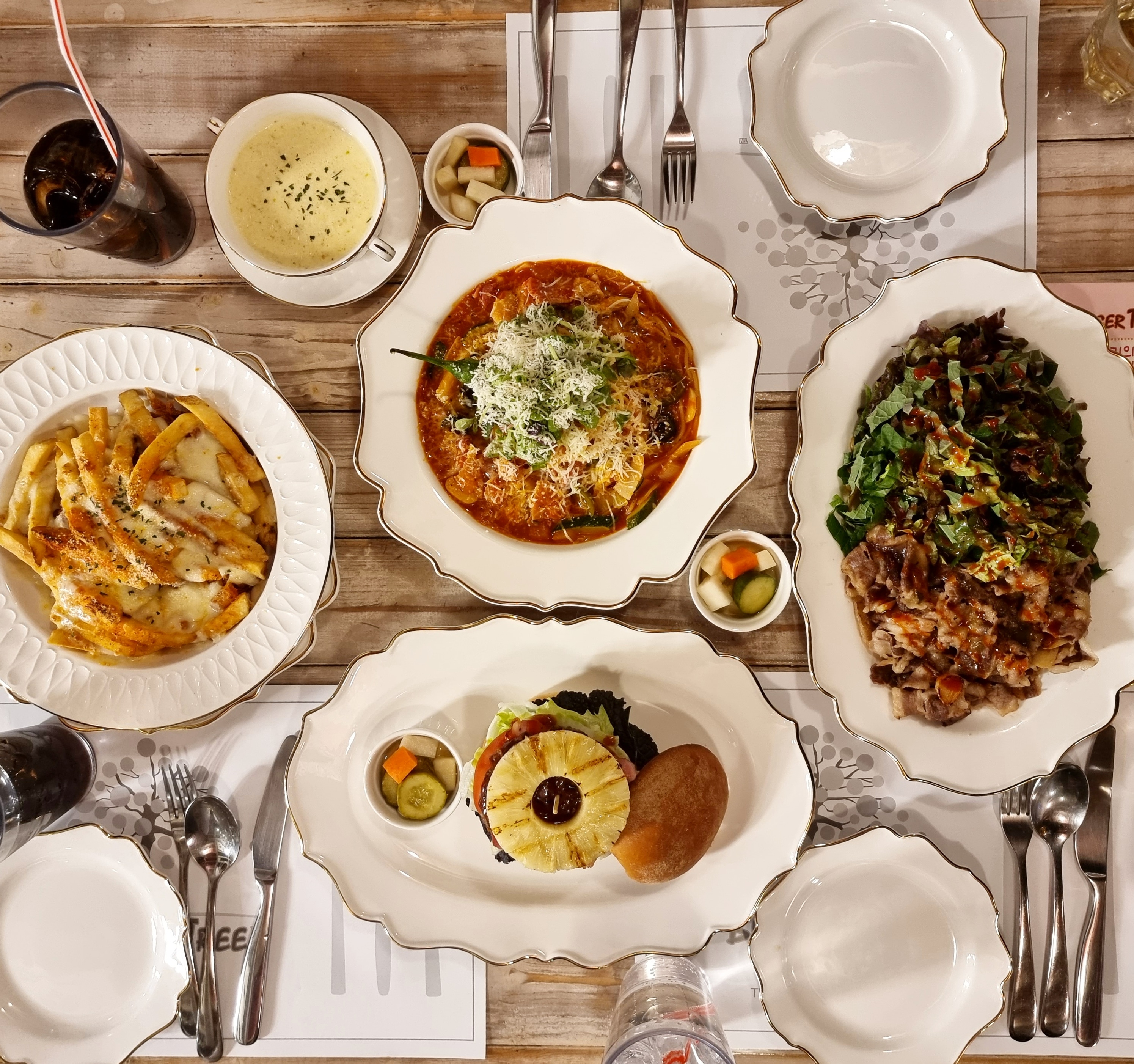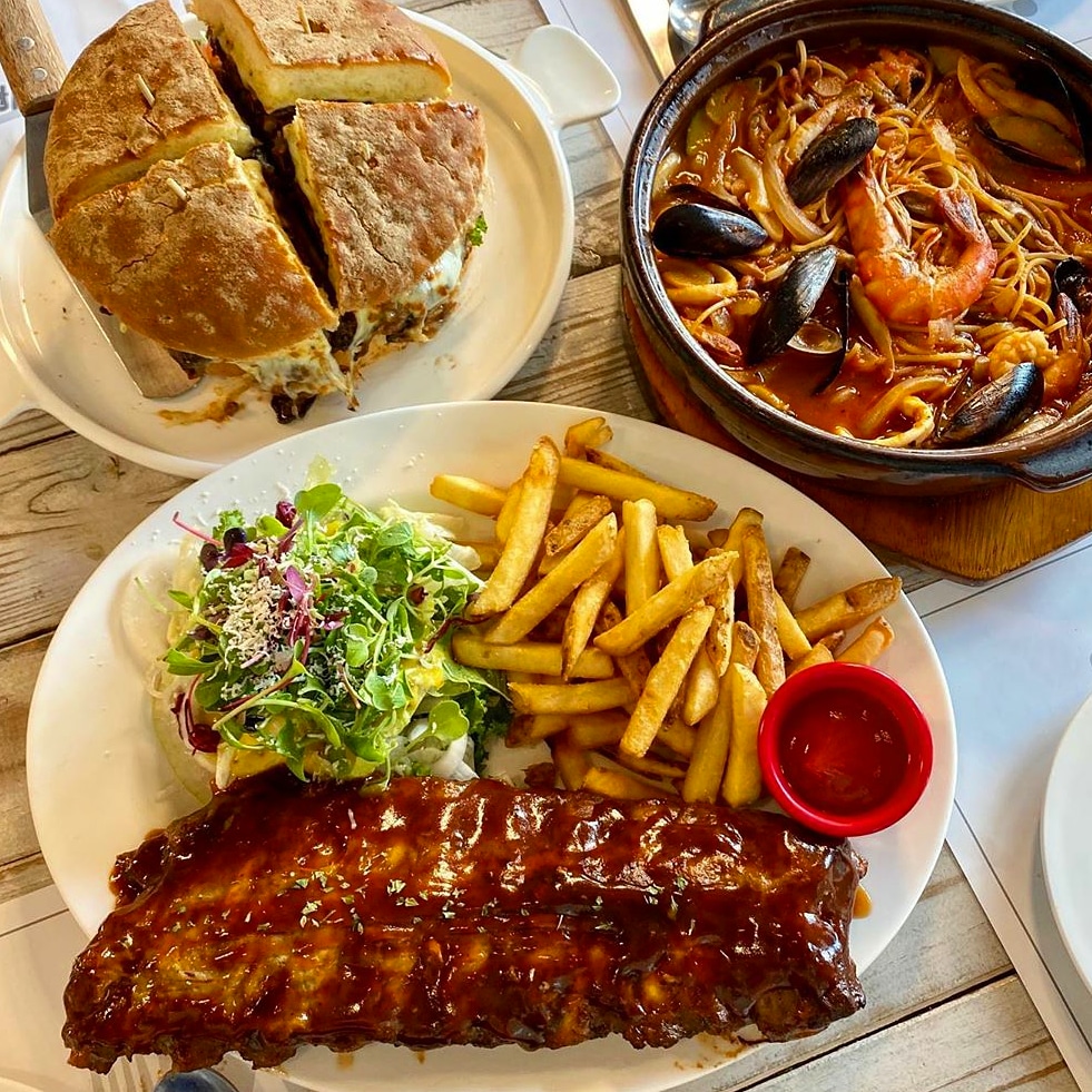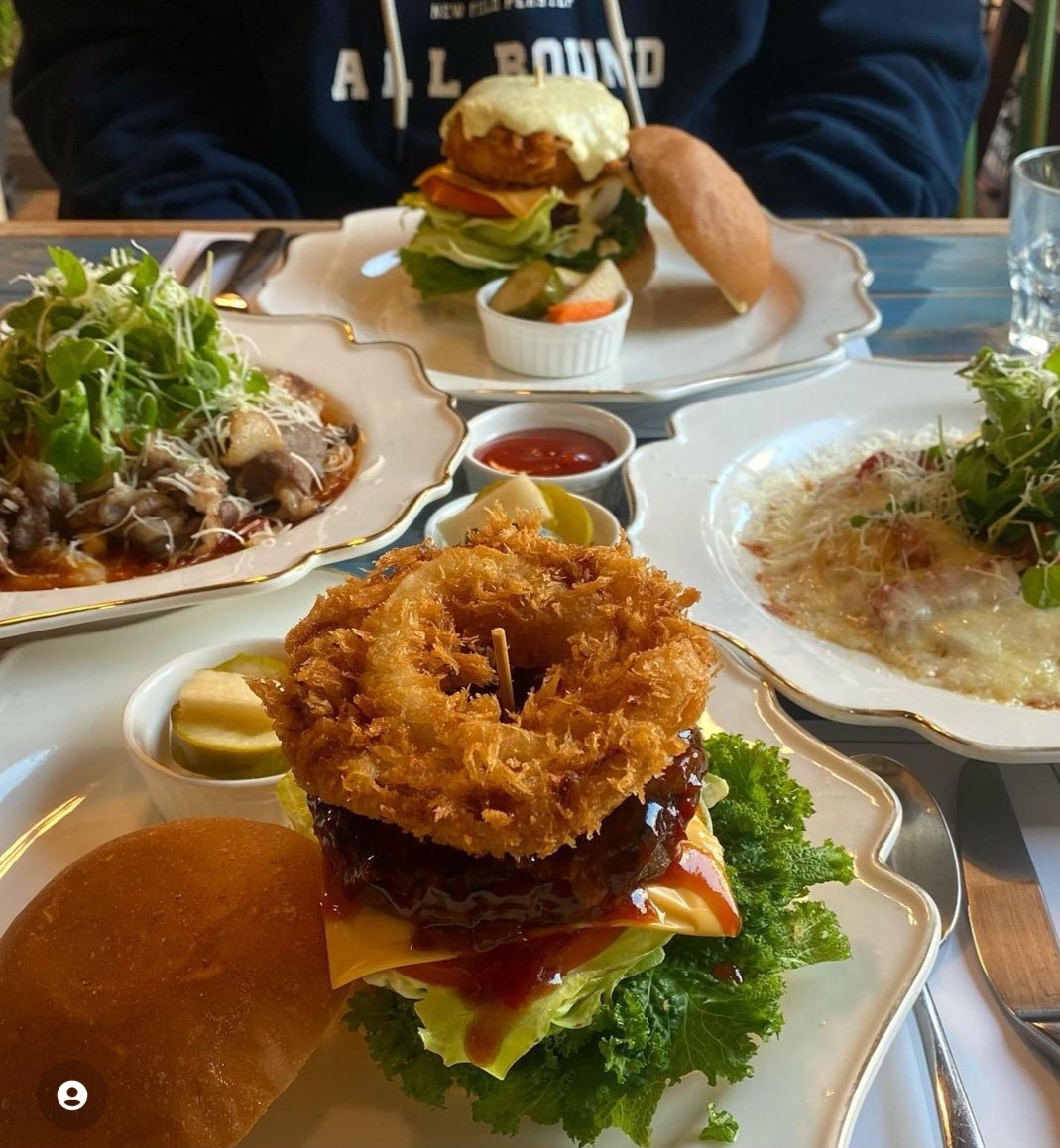 지기지우10하와이안 버거세트, 토마토 파스타, 해산물 누룽지 파스타를 주문했습니다. 다른 두개는 예전에 리뷰를 남겼기에 하와이안 버거만 말하자면(이것도 남긴듯 하지만 정확히 기억안나서) 구운 파인애플의 단맛이 버거와 조화롭지 않을 줄 알았는데 의외로 베이컨, 패티와 어울려 단짠 조합을 이룹니다.