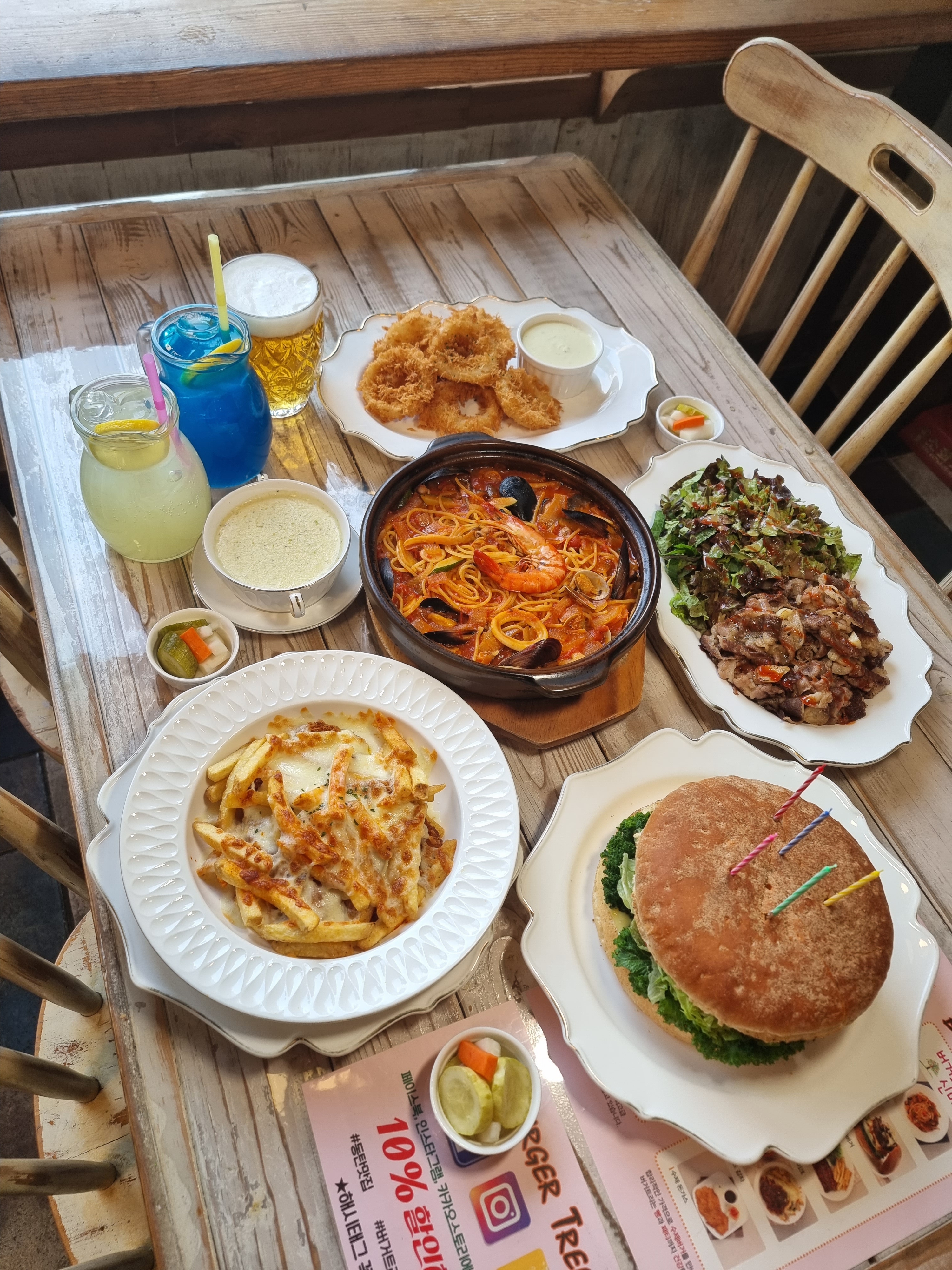 응깅이일 끝나고 동탄맛집 왔네요ㅋ 작년9월에 오고 오랜만에 온거라 더 맛있는 버거트리ㅋ 뚝배기해물스파게트 하와이언햄버거ㅋ 어니언링 뭐하나 빼놓지 않고 맛있음ㅋ 배불리 먹고 갑니다ㅋ