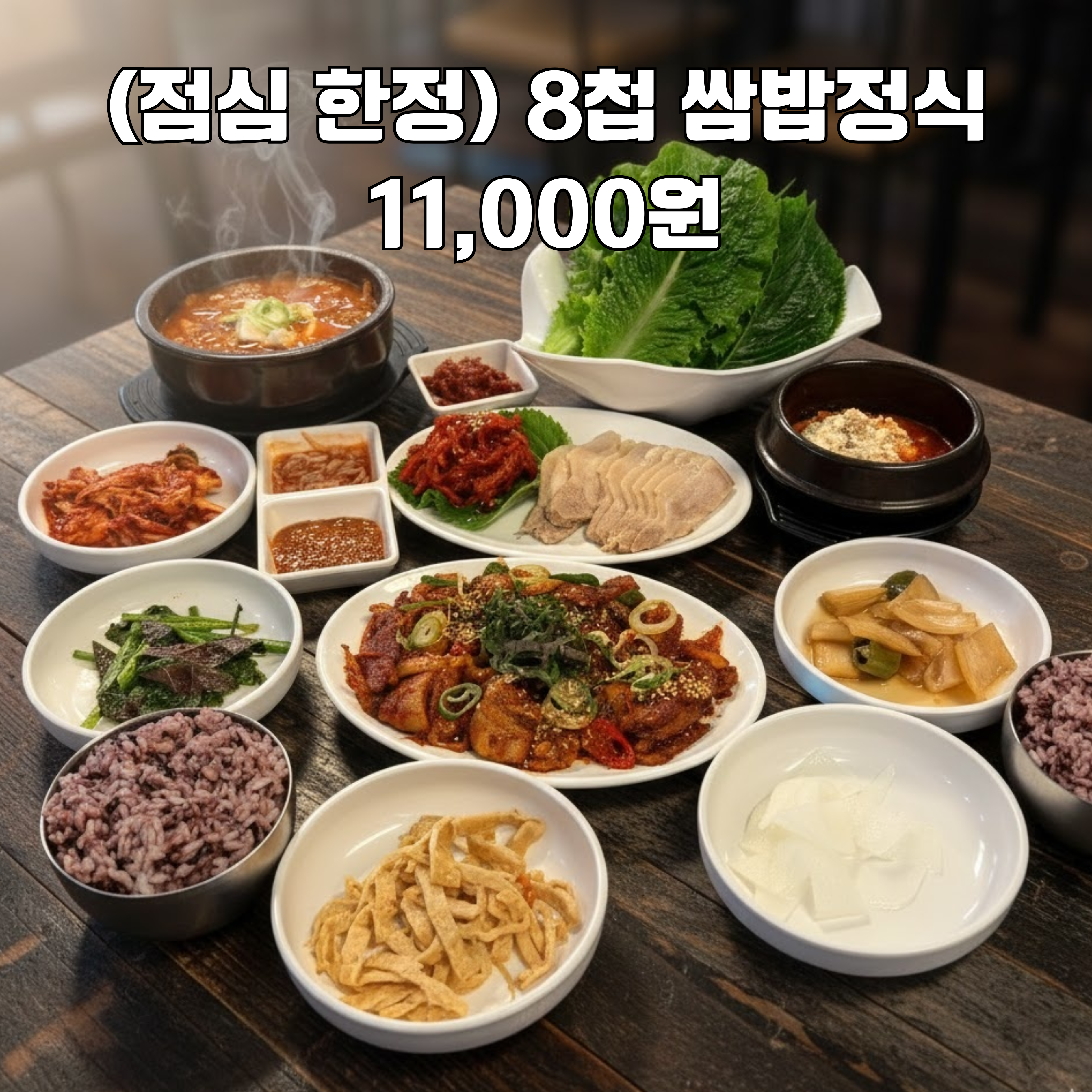- 8첩 쌈밥 정식(제육,보쌈) 11,000원