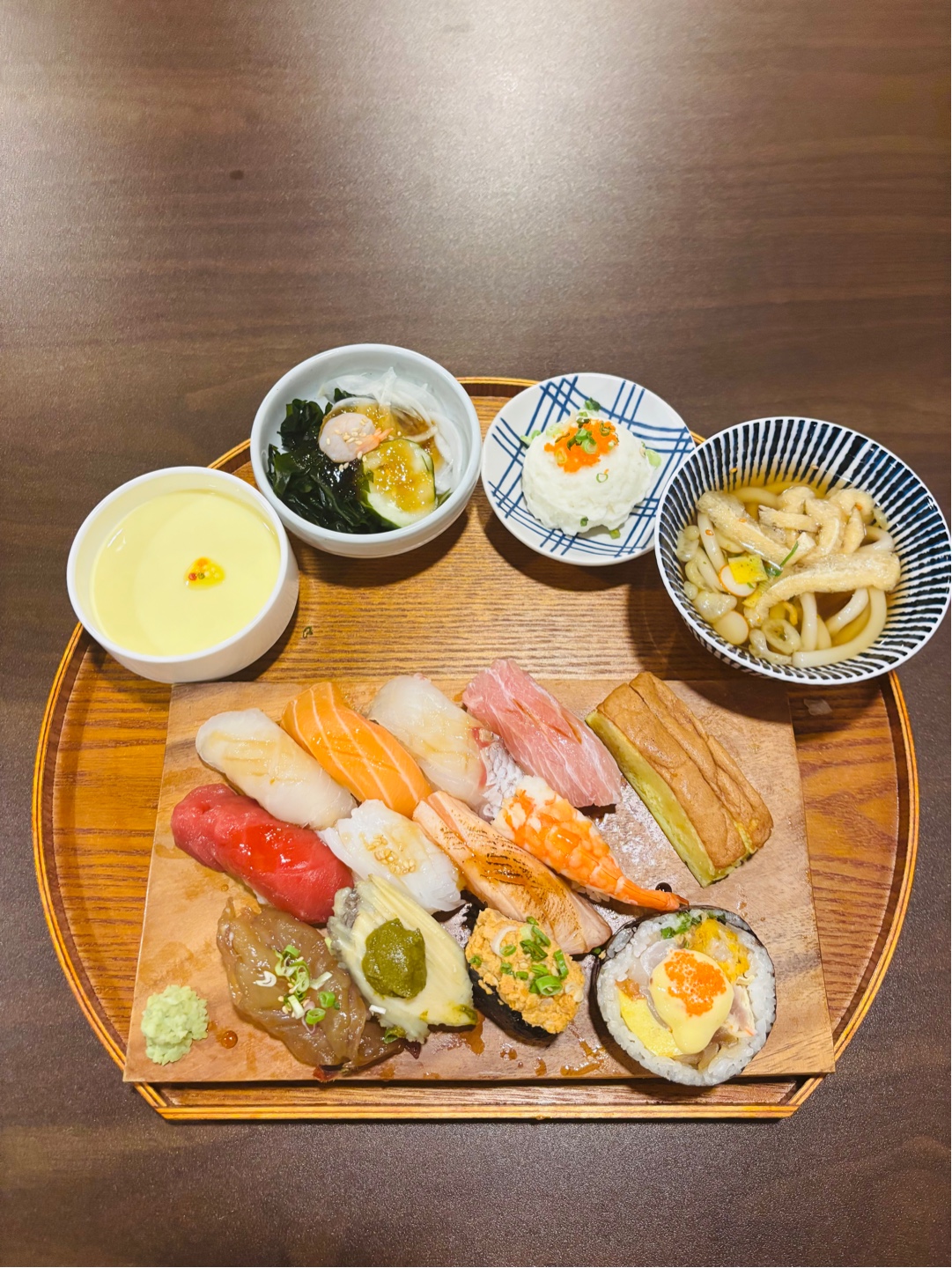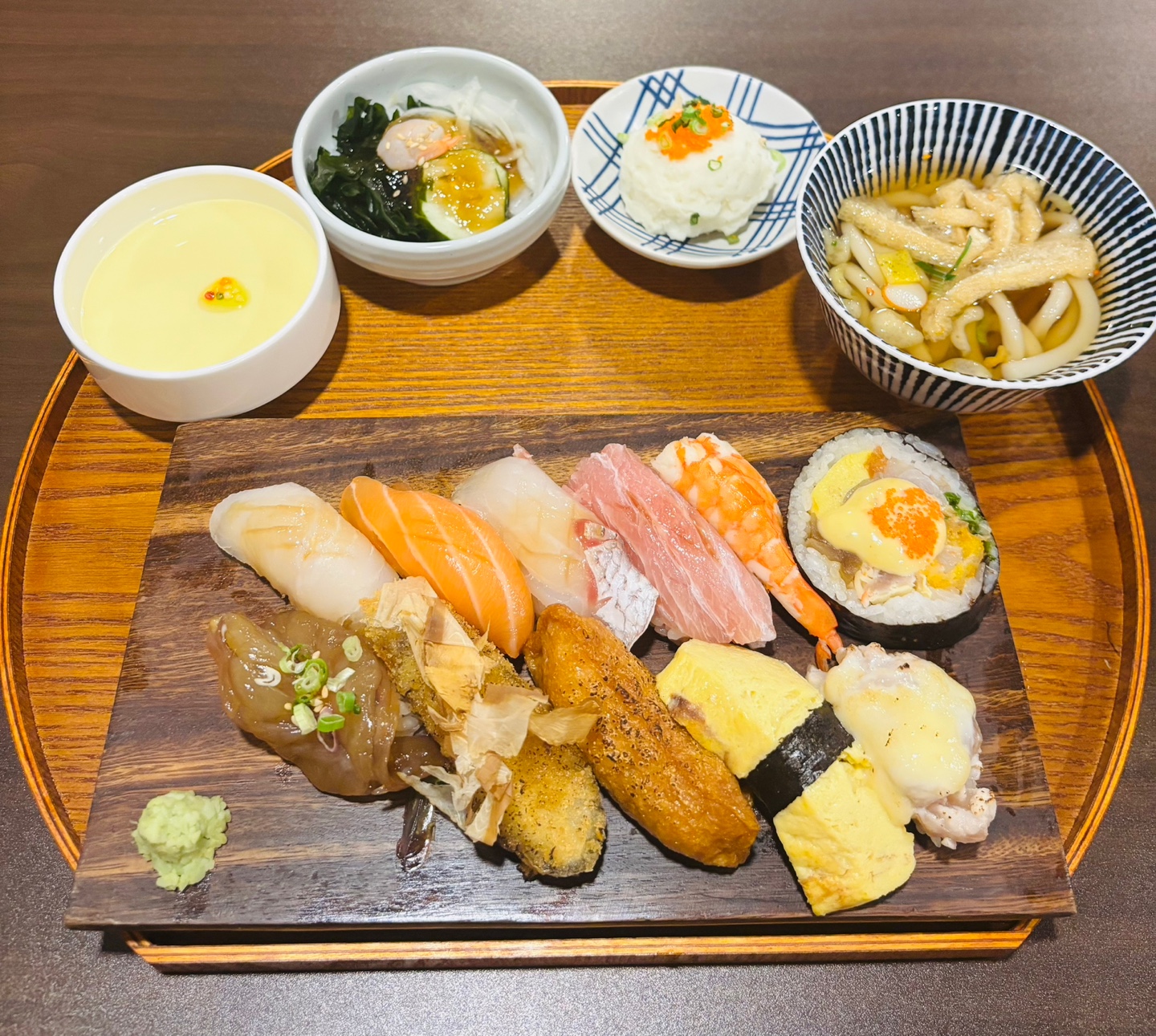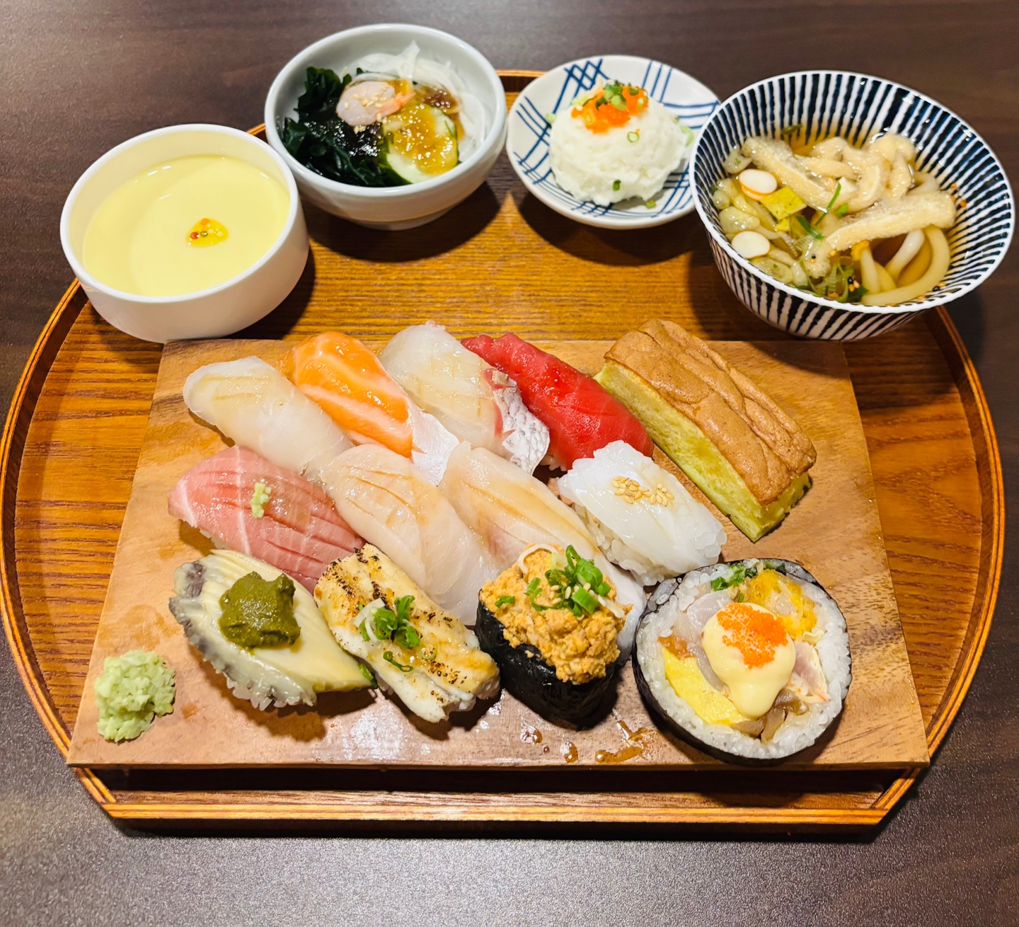 SophiaS달걀찜, 초회, 감자샐러드, 우동에 스시까지 나와 세트 메뉴 구성이 좋다고 느꼈어요 샤리가 약간 견과류 맛이 느껴져서 고소한 편이에요 사시미에 다 칼집이 섬세하게 나 있어 결에 따라 씹는 맛이 좋았습니다