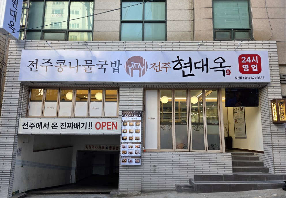 푸얌푸야미십여년전 익산에 여행가서 처음 먹었던 현대옥의 콩나물국밥, 어린이입맛이었던 시절인데도 엄청 맛있게 먹었던 기억이 있어 남천동에 현대옥이 개업했을때부터 큰 기대를 갖고 있었습니다. 마침 어제부터 감기기운으로 콧물을 훌쩍이고 있던 터라 현대옥의 뜨듯한 국밥으로 속을 따뜻하게 하고자 방문하였습니다. 대표메뉴인 토렴응용식 남부시장스타일에 오징어사리 추가하고 모주도 한잔 주문했습니당! 토렴식은 바로 끓여서 나오는게 아니라 국밥이 그렇게 뜨겁지 않았어요. 같이 나온 수란에 김, 오징어사리 몇점, 국밥국물 4숟갈 넣은 다음 섞어서 먹으면 고소하고 든든합니다. 콩나물국밥은 텁텁함이 전혀 없는 딱 깔끔한 맛이예요. 맛있어요!