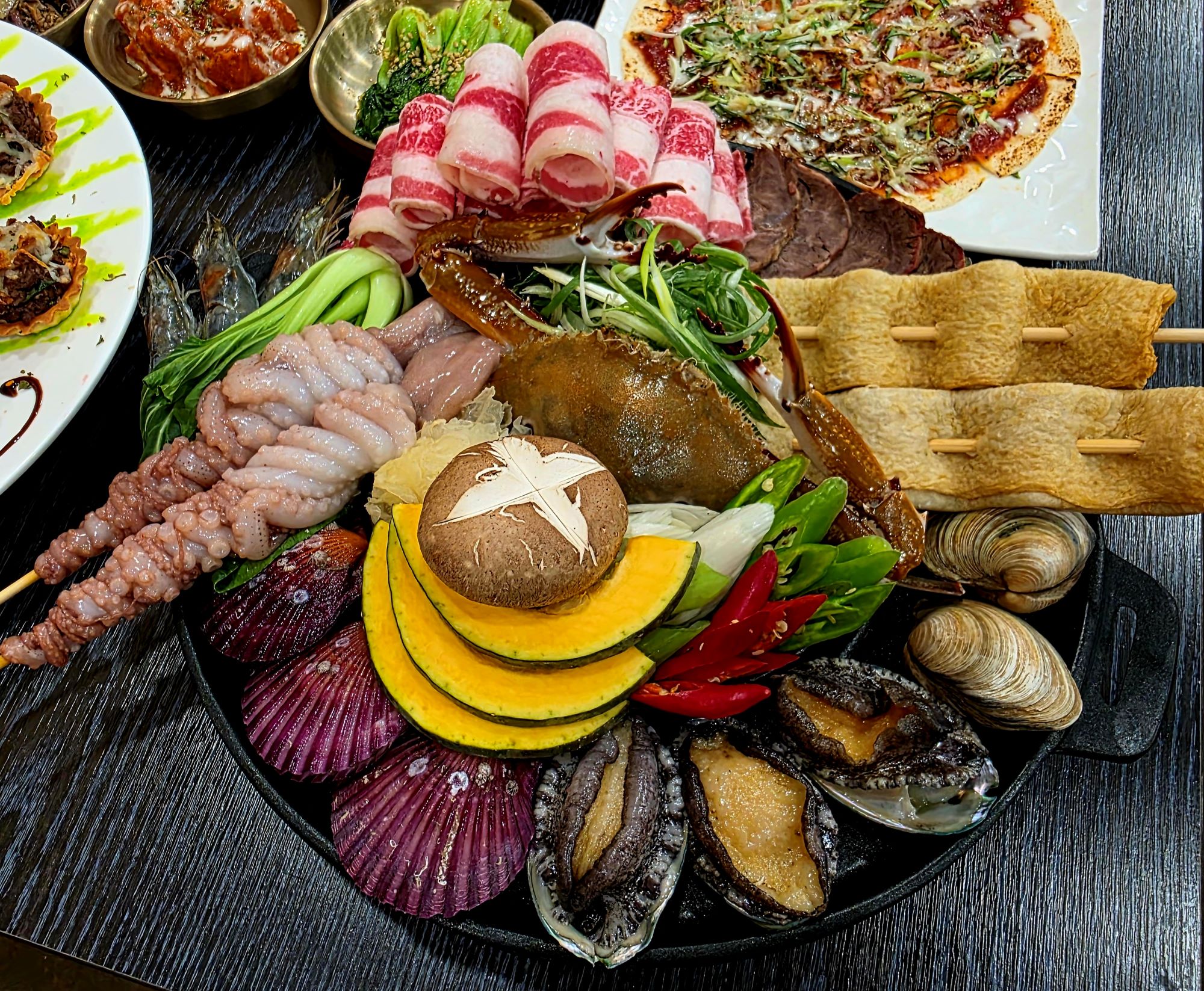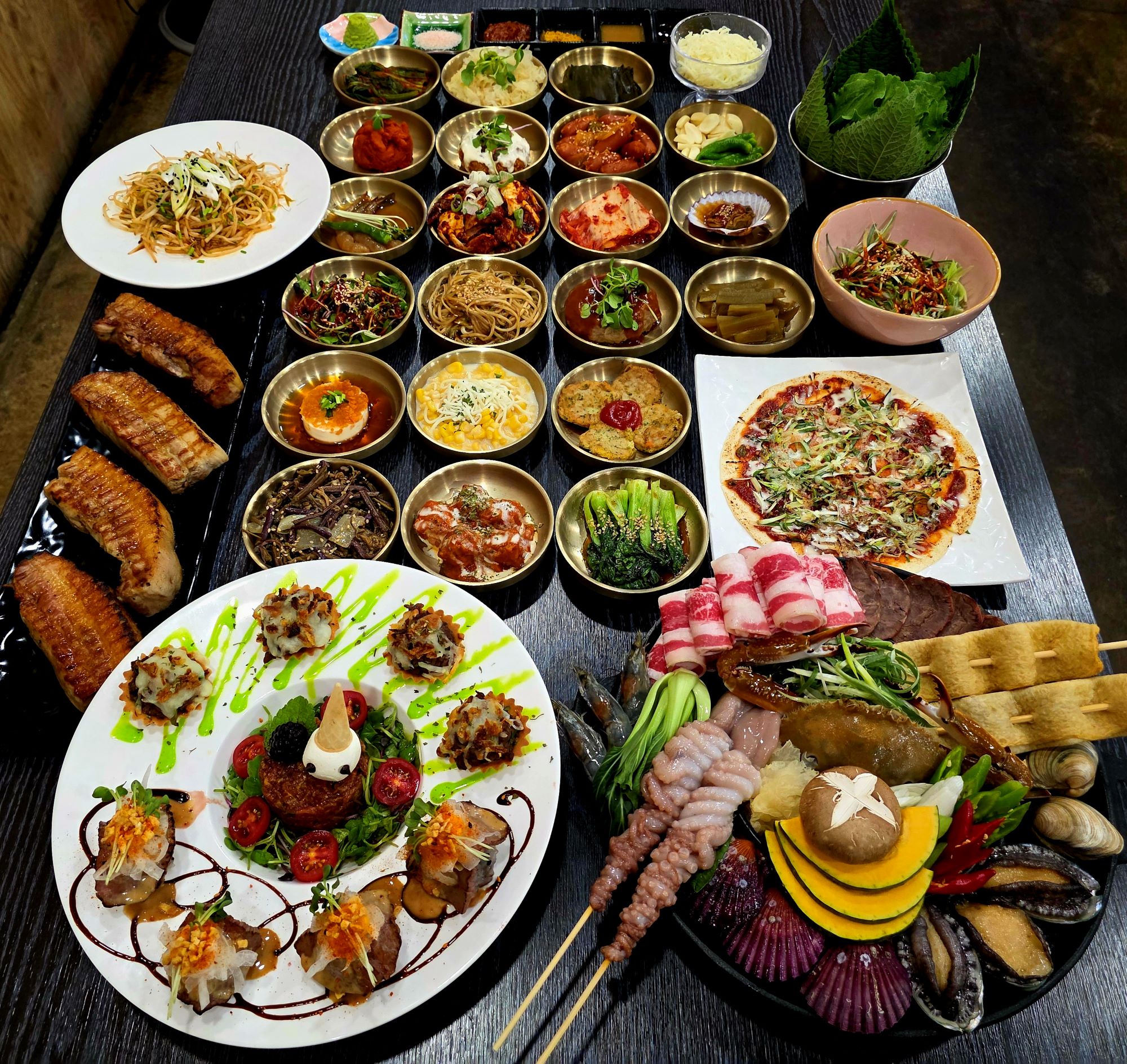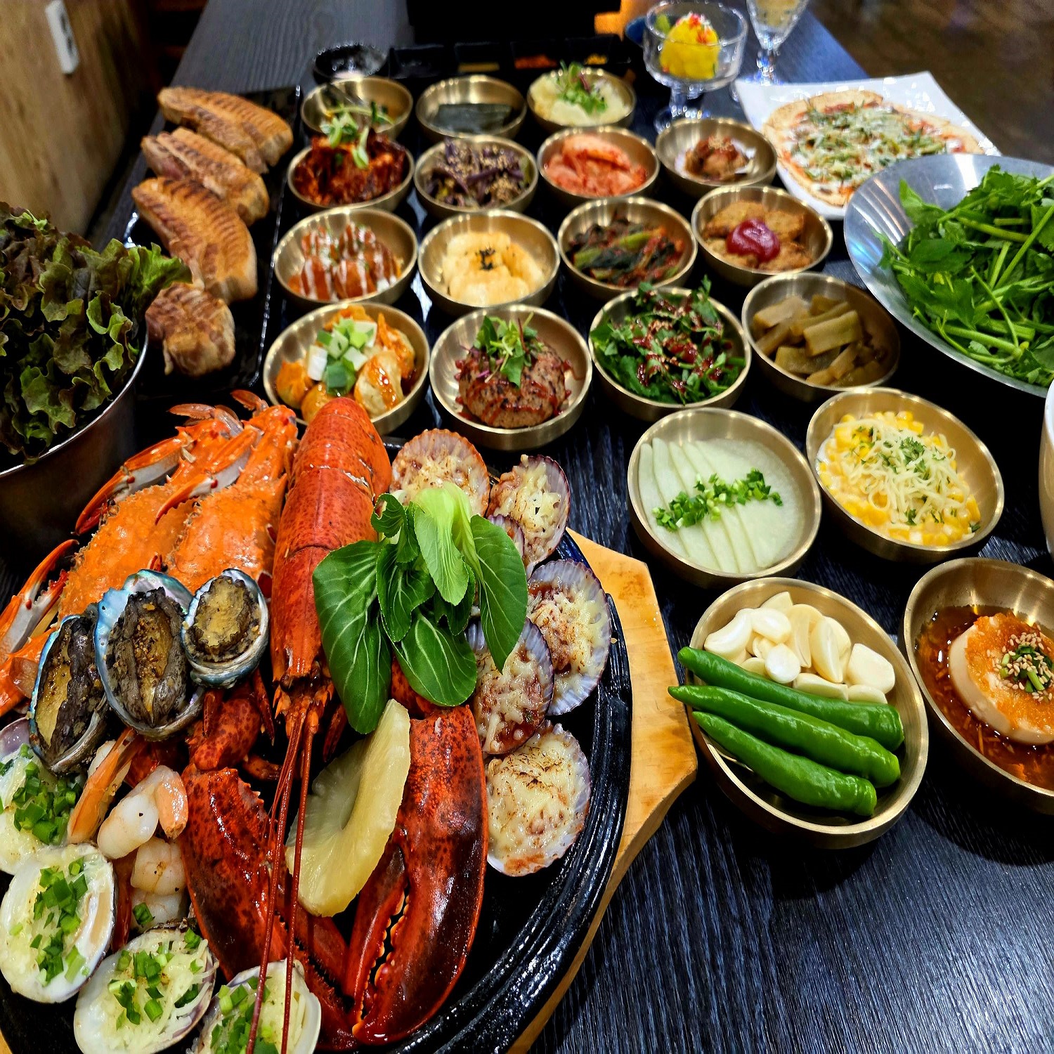 환희며칠전 봉명동 사는 죽마고우 친구와 봉명동에서 술자리를 가졌습니다. 저희 본가랑 친구네 집이랑 바로 옆동이라 간혹 봉명동에서 보곤 하는데요. 본가 그근처에 맛있고 푸짐한 삼겹살 맛집이 있다고 해서 방문한 '봉명동 돈드림' 입니다. 위치는 봉명동 아이파크 정문 인근 번화가에 위치하고 있구요~ 정문에 통삼겹살 구이 라고 써있습니다. 글씨부터가 먹음직스럽습니다. ㅎㅎ 내부 모습입니다. 넓은 홀형태로 되어 있고 깔끔합니다. 이곳에서 오래 영업을 하셔서 단골이 많은 느낌입니다. 메뉴판 입니다. 최근에 유자에이드랑 블루 레몬에이드가 추가된거 같구요~ 고기집 답게 메인은 왕소금과 허브 통삼겹 바베큐랑 생삼겹살, 목살,가브리살 등이 있고 짚불 통갈매기 바베큐 도 있습니다., 이외에 고기랑 아롱사태쫄면 우삼겹숙주볶음,해산물이 포함된 회장님 세트 직화고기와 아롱사태쫄면이 포함된 사장님 세트 고기와 해산물이 포함된 홍사부 낭만세트,랍스타까지 포함된 대표님 세트,이사님 세트등 세트메뉴도 매우 다양하고 채끝살과 갈비살,육회 등 한우도 판매하고 있습니다. 그리고 사이드로 냉면,소면,된장찌개,누룽지탕, 계란찜,새우장,양념게장,타코,된장술밥,볶음밥 등도 있고 주류도 하이볼,하이네켄,타이거 생맥주등과 와인까지 엄청 나게 다양 하네요~ 저희는 이미 사장님 세트를 예약을 하고온 상태였습니다. 그리하여 푸짐하고 맛있게 잘차려진 '사장님세트' 입니다~ 정말 처음에 보자마자 우와 했어요 ㅋㅋ 고기까지 포함해서 59,000원이면 가성비 정말 훌륭합니다!! 파채와 장아찌류, 순두부,비엔나소시지와 미트볼,각종김치류,새우장 무쌈,동그랑땡!! 피자의 비주얼을 가진 멕시칸 타코!! 고기랑 같이 싸먹으라고 설명해 주셨습니다. 만두국과 양념게장!! 상추와 파김치, 고사리 까지 정말 엄청난 구성 입니다~ 그리고 오늘의 메인인 통삼겹살 구이가 등장 합니다~ 먹기좋게 잘라서 직원분이 잘 구워 주십니다~ 이모든게 고기까지 합쳐서 59,000원 이면 정말 훌륭하네요. 대접받는 기분이 들더라구요~ 이타임에 술이 빠질수 없죠 ㅋㅋ 오늘은 가볍게 하이네켄 생맥으로 시작할 예정 입니다. 고기가 익는동안 미트볼, 간장게장,간장새우,동그랑땡 등을 맥주와 함께 입가심 해줍니다~ 하루의 피로가 싸악 날라가네요~ 지글지글 잘익어가는 고기 옆에 고사리랑 파김치도 같이 올려주고요~ 직원분이 친절하게 설명해 주시면서 잘 구워 주시더라구요~ 중간에 직원분이 오셔서 치즈도 얹어 주셨습니다. 일단 잘익은 고기를...