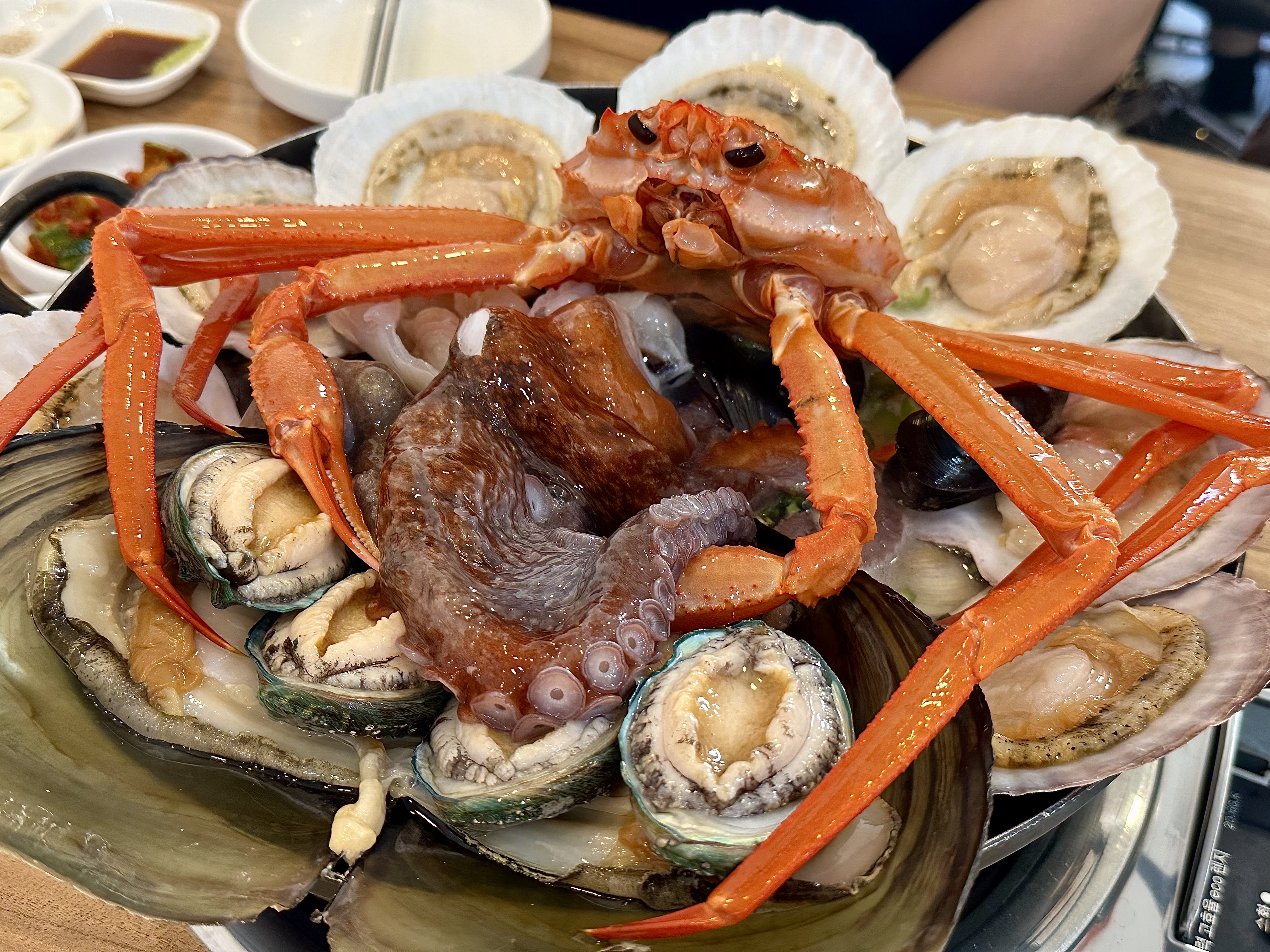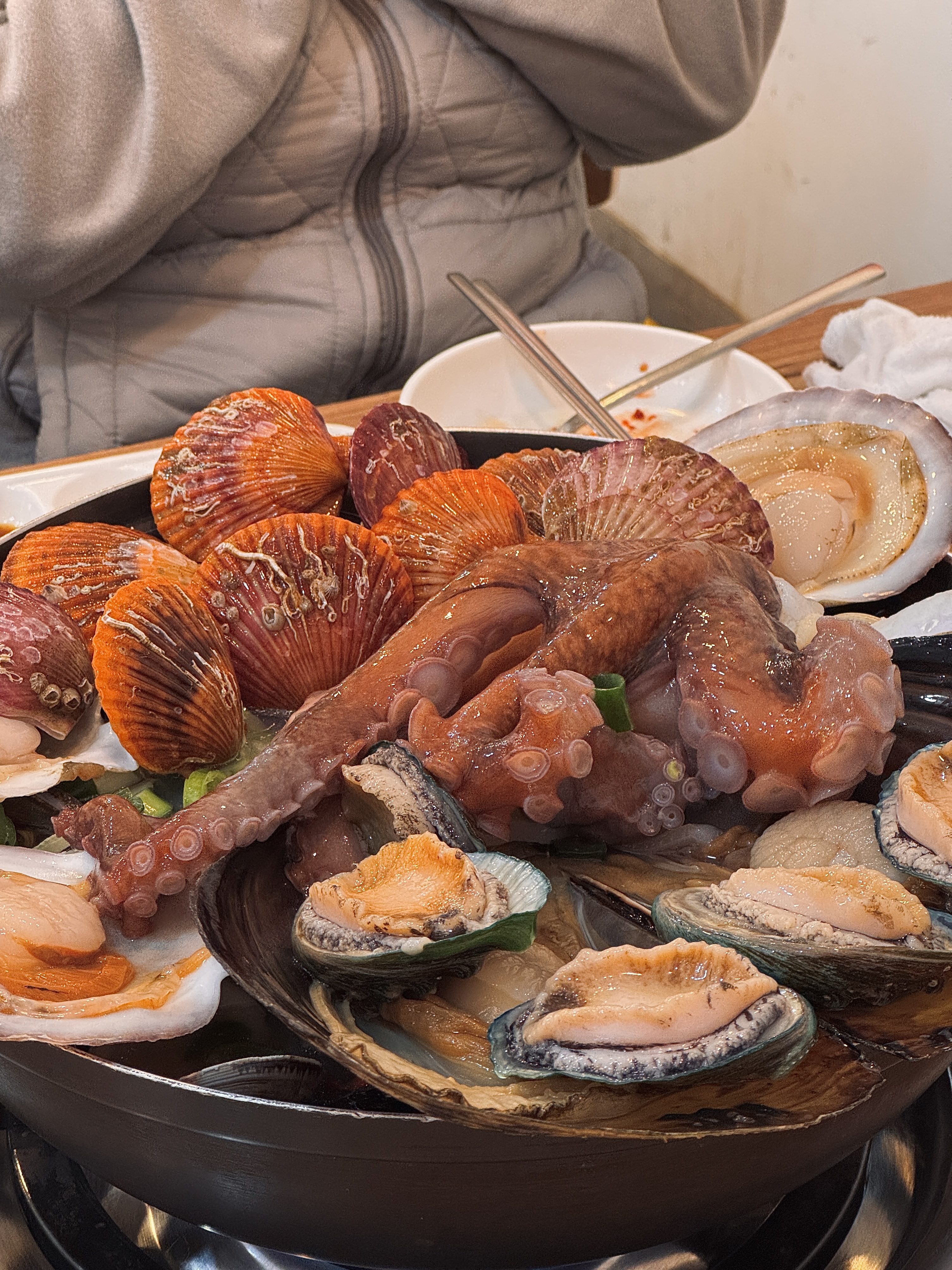 Muche100% 생물만 취급하는 해천탕 원조 ‘홍대포’ ️ 영업시간 : 월요일 제외 11:30 - 22시 ⏳ 라스트 오더 : 20:50 예약 및 문의 : 0507-1455-9782 주차 : 매장 앞 주차 (2~3대) 감추 해수욕장 : 도보 6분 천곡 황금박쥐동굴 : 차로 3분 동해시 종합버스터미널, 묵호역 : 차로 6분 동해 현지인한테도 유명하고 이 곳 해천탕 먹으러 타지에서 오는 손님이 많아 재료 소진 시 조기마감 되고 웨이팅하지 않고 먹으려면 예약이 필수인 신선한 해산물의 해천탕이 유명한 동해 맛집이에요 2011년부터 ‘좋은 재료는 거짓말을 하지 않는다’는 원칙으로 생물 해산물을 하나하나 직접 보고 만져 공수하고 손질해 요리하신다는 사장님은 들어가니 밝고 친절하게 반겨 주시고 홍대포 간판과 맞춘 화이트 & 레드 톤의 인테리어로 가족 모임이나 단체 회식에 적합한 넓은 매장과 단체석이 구비되어 있어요 우선 들어가자마자 풀예약인지 전 테이블에 상차림이 세팅돼 있는 게 인상적이더라구요 주방은 오픈 키친 형태로 바로 옆이었던 저희 테이블에서 가까이 잘 보이고 위생적이었어요 차림표는 홍게 + 자연산 섭 추가된 홍대포 스페셜 문어연포탕 (문어 + 낙지) 해물닭한마리 / 해물닭도리탕 (해산물 + 닭) 문어숙회 (냉/온) 등 선택지가 많아요 배추, 쌀, 고춧가루와 대게/홍게, 문어, 전복, 홍가리비, 조개류 모두 국내산 Today's bites 커플 해천탕 60.0 문어김치볶음밥 10.0 칼국수 사리 2.0 기본찬으로 겉절이, 양배추 샐러드, 두부간장 오이소박이, 양파장아찌, 계란찜 개인별 소스로는 와사비간장, 소금, 매운 소스가 있어요❕ 커플 해천탕 비주얼이 와 소리 절로 나오는 살아 움직이는 문어와 전복, 가리비 등 신선한 각종 해산물이 들어간 해천탕이 나왔습니다 맑은 국물은 고추 송송 때문에 시원하고 꽤 칼칼해요 ️ 감칠맛 깊은 게 해장하러 왔다 다시 술을 부를 것 같은 조금 끓으면 조개류 먼저 건져먹으라 알려주시는데 엄청 통통한거 보이나요 신선한 게 그대로 느껴지고 씹는 맛 톡톡 먹고 있다 보면 사장님이 오셔서 가리비 껍데기 위에 문어와 전복을 먹기 좋게 발라 손질해 주세요 ✂️ 통통한 문어는 연해서 질기지 않고 약간 단맛도 나면서 넘 탱글탱글해요 짠 맛 같은 건 전혀 안 나고 어른들 모시고 가면 되게 좋아하실 것 같단 생각이 들었어요 ☺️ 그리고 해산물 밑에 닭도 깔려 있단 것❗️ 푹 익은 살이 너무 촉촉하고 연했어요 잡내 0 ,, 소금에 살짝 찍어 먹으면 2차전 시작 문어김치볶음밥 문김볶밥은 달지 않고 참기름 맛이...