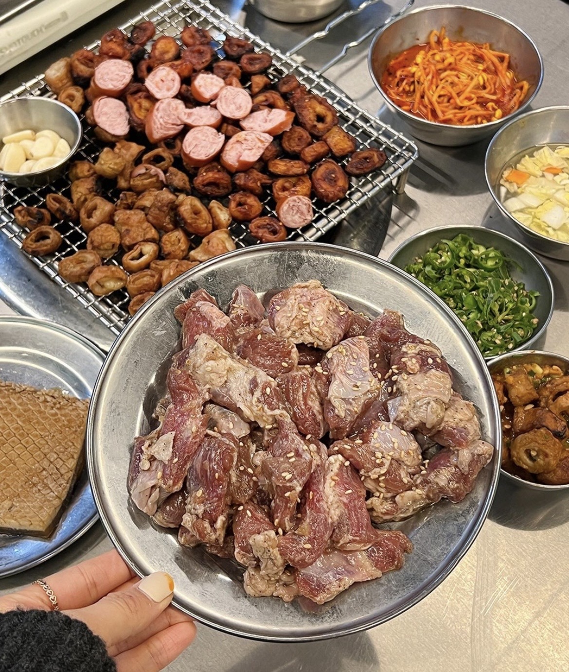 오랜만에 대구 온 김에 아묻따 막창 가잣 !!! 숙소 근처에 있던 #우야지막창 방문했어요 두근두근 저는 학교 앞 옥돌막창만 팼던 1인이라 우야지 방문은 너무너무너무 설레더라구요 ! 9시 40분쯤 방문했는데도 식사하시는 분들이 계셔서 내부 사진은 찍지 않았지만 1층과 2층이 구비되어 있어 단체도 가능해요 특히 여기 자정까지에요 ㅠㅠㅠㅠㅠ 너무 좋아 저희는 사장님 추천으로 먼저 주문했어요 기본 1 / 양념 1 / 껍데기 1 밑반찬부터 맛있어보이기 반칙인데 하 계란말이 가짜 아니고 찐이에요 진짜 크고 통통하고 포실포실해요 이어서 나온 기본 막창, 초벌이 되서 나왔는데 벌써 먹음직스럽죠 이래이래 휘젓거리다가 집게 사장님한테 뺏김 ㅋㅋㅋㅋㅋㅋㅋㅋ 사장님이 직접 다 구워주셨어요 ... 호호호 사장님이 양념장 + 콩고물에 찍먹하면 맛있다고 추천해주셨어요 하 다시 봐도 군침 근데 제 픽는 막장인디 ......... 사진이 없어요 미리 다운 안받아서 만료엔딩 ... ⭐️ 조만간 다시 요청해야겠어요 막장은 여러분들이 아는 그 막장이 맞고 거기에 파와 청양고추가 따로 제공되서 기호에 맞게 넣어 먹을 수 있어요 냠냠 다음은 껍데기 이거 강추한 이유가 있으셨어요 하나도 안 딱딱하고 쫀쫀하고 부드럽고 안 느끼해요 혼자서 2인분도 먹을 수 있어요 ㅠㅠㅠㅠ 마지막으로는 지글지글 매콤한 맛으로 마무리 싹 근데 저희는 양념이랑 껍데기 한개씩 더 먹었어요 진짜 배 열어놓고 먹었어요 본점은 본점인지 너무너무너무 맛있어요 쏘맥도 진짜 너무 시원하고 미니 팥빙수도 귀엽고 무엇보다 사장님과 직원분들도 친절하시고 2월의 대구가 더 행복한 기억으로 남을 수 있었던 이유 잘 먹었습니다 우리돈 우리산 ♥️
