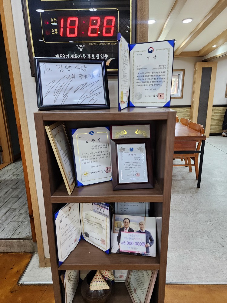 onmyway86몇년 전 구미에 놀러왔을 때, 아이를 데리고 에코랜드에 온 적이 있다. 그때 에코랜드 맛집, 산동 맛집으로 열심히 검색을 했을 때 보았던 산동 장안식당~ 산동장안식당은 구미한식맛집으로 유명한 곳이어서, 장거리 운전을 해야하는 날 점심을 든든히 먹기 위해서 방문해보았었다~ 에코랜드에서 산동으로 오는 길에 보이는 큰 간판 산동장안식당은 바로 옆에 골프장이 있다보니, 에코랜드에 아이와 함께 방문하는 가족도 많이 방문하지만, 골프장에 다녀온 사람들도 많이 방문하는 구미맛집이다. 지인들도 보니 골프장이 전국에 흩어져있다보니 골프장 사람들이 많이 방문하는 곳은 맛걱정이 전혀 없는 그런 곳인듯~ 내부는 단체 식사가 가능할 정도로 엄청 넓었다~ 골프장에 다녀온 사람들도 있지만 특히 현지인들도 와서 맛있게 식사하고 있었다~ 가운데 셀프바를 기준으로 양쪽으로 나뉘는데 왼쪽이 좀 더 넓은편! 단체로 방문하기에도 좋다고 느꼈던 점이 안쪽켠에 방이 준비되어 있었다~ 그래서 낮에 가족 모임을 하는지, 구미맛집 산동장안식당을 방문한 할아버지네는 바로 이 안쪽으로 들어가셔서, 미리 전화로 예약해두면 조용히 식사를 즐길 수 있지 않을까 싶었다. 구미맛집인 산동장안식당은 여러 상도 받았고 사회 공헌도 많이 하는 곳~ 한국식문화세계화대축제에도 나가고, 한식대가 표창?도 있고~ 집에서도 먹을 수 있는 된장, 청국장으로 맛집 타이틀을 가져갔으니 얼마나 맛있다는 것일까! 산동장안식당 메뉴&가격 장안식당에서는 크게 청국장과 된장찌개가 메인으로 나뉘었다~ 여기에 석쇠 불고기나 고등어 한마리를 추가시켜서 먹기도 하는데 우리처럼 정식을 시키면 석쇠불고기나 고등어도 함께 맛볼 수 있어서 더 가성비좋지 않을까 싶었다~ 정식 2인분 이상 주문을 하면 3만원이니깐~ 그냥 된장이나 청국장만 유명한 것이 아니라 반찬들도 마치 집에서 담근것처럼 신선했었다~ 경주에 있을 때에도 한식집 방문해서 메뉴 하나씩 찍지는 않았었는데, 너무 깔끔해보임~ 삼겹살도 구워 먹는 사람들을 보니 돼지도 좋은 고기를 가져오는지 얆게 저민 수육과 함께 채소를 함께 싸먹으니 부드러운 식감이 너무 좋았다. 우리는 고등어 된장을 시켰는데 비벼먹을 수 있는 큰 그릇이 나와서 처음에 뭐지?? 싶었었는데 나중에 된장찌개를 더 맛있게 먹는 비법이었다. 산동장안식당에서는 아이와 함께 방문하기에도 좋다고 느꼈던 부분이 누룽지를 셀프로 처음부터 준다는 점~ 한때 숭늉 만들어 먹으려고 돌솥밥만 찾아 다닌 적도 있는데, 이렇게...