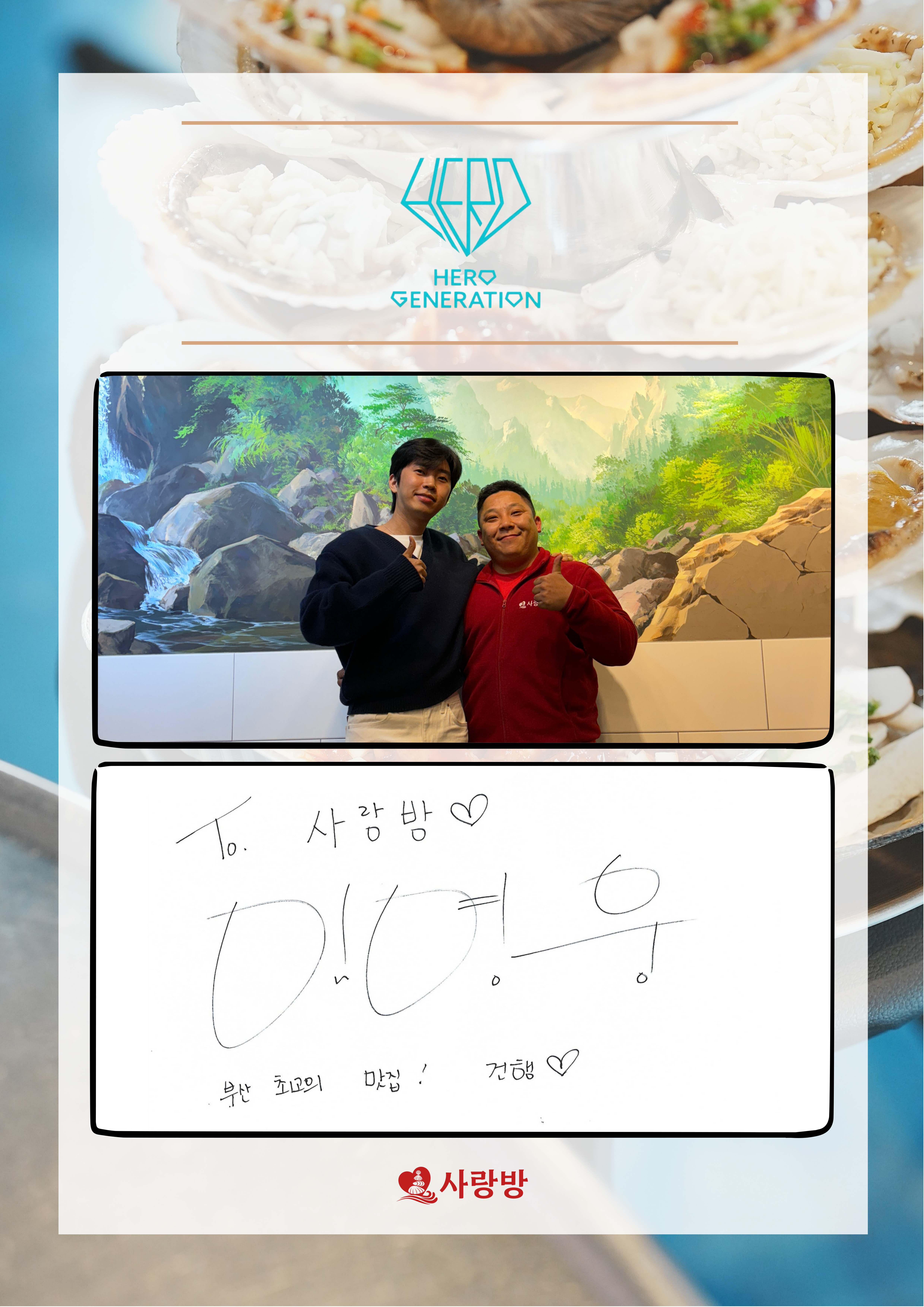오징징해윙~! 오늘도 돌아온 징징맛 오늘은 어떤 맛집을 소개 할까 하다가 지난 여름 무더운날 뿌셨던 조개구이집 하나 소개할까 한다. 그럼 포스팅 꼬우~! #사랑방 부산 영도구 태종로 816 2층 507-1324-2953 영업시간: 12:00~23:00 단체이용가넝, 예약가넝, 반려동물동반가넝, 주차불가넝 (낮에는 인근 공영주차장 이용하고, 저녁에는 인근 주차 가넝) 3대째 내려오는 26년동안 정직하고 한결같은 마인드로 사랑방을 운영한다는 사장님. 사랑방은 단순히 음식만을 파는게 아닌, 내 가족에게 음식을 대접한다 생각하고 품질좋은 식재료를 제공 그리고 그것을 합리적인 가격으로 제공하조 한다고 한다. 사실 나도 찐 영도인에게 추천받고 간거라 모 어떻길래? 하면서 갔는데... 오우 괜찮더라고! 사진보면더 더 이야기 해볼가나? 회사 마치고 간터라 아주아주 즐거운 마음으로 달려간 영도의 태종대였다. ㅋㅋ 2층집인데 내부 테이블있고 야외 테이블이 양쪽으로 쭈루미 있어서 쫌 추워지면 가면 너무 괜찮겠다 했음. 이날은 진짜 핵핵 더운 여름이였기에 가게 안에서 먹기로 함. 생생정보토에도 나왔던... 근데 주인장 아들 지금은 이분이 사장이겠지... 이름이 황재승이다.. 숨어있던 내남편 여기 있군요.... 가게 둘러보는데 직원들이랑 재밌게 소통하는거 같아서 보기 좋아보였다. 사랑방 메뉴 일단 메인메뉴는 조개구이 이며 대/중/소 로 나위어 있다. 구이류가 귀찮으면 해물모듬 찜도 있움! ㅎㅎㅎ 우리는 이날 왜 조개구이를 먹었는지 모르겠으나 일단은 조개구이로 ㄱㄱ 조개구이 대자로 시켜보았다. 기본 반찬 생야채와 파김치가 나왔는데 요 파김치가 참 맛났다. 그냥 보기만해도 고춧가루 팍팍해서 양념이 잘 베긴 침고이는 파김치였음. 그리고 계란햄전, 홍합탕이 나왔다. 담치탕인가...? 워매 4단으로 올린 조개구이 나왔다. 사랑방 만의 특이점이라면 차별하된 조개이다. 4가지 소스를 올려서 나오는데, 고추장베이스로한 기본소스 / 카레베이스 양념 / 모짜렐라치즈 / 땡초버터만 올린것 요렇게 4종류 조개들이 고루 있어서 다양하게 맛을 즐길수 있다. 조개구이 먹고 부족하면 가리비만 더 추가할 수 있음 이건 12,000원 이다. 연탄 들고와주시고~ 조개를 얹혀서 굽기 시작했다. 조개구이는 진짜 성가셔서 그렇지 너무 맛있는거 같다. 오동통한 살 짭쪼름한 가리비! 진짜 완내스 !!!!!!!! 그리고 하나는 굽기 좋은 가리비만 있어서 좋았당. 아 그 조개류 이름이 기억이 안나는데 막 균형못잡고 국물 다 떨어지는거 있는데... 무튼 그거 없고 가리비만...