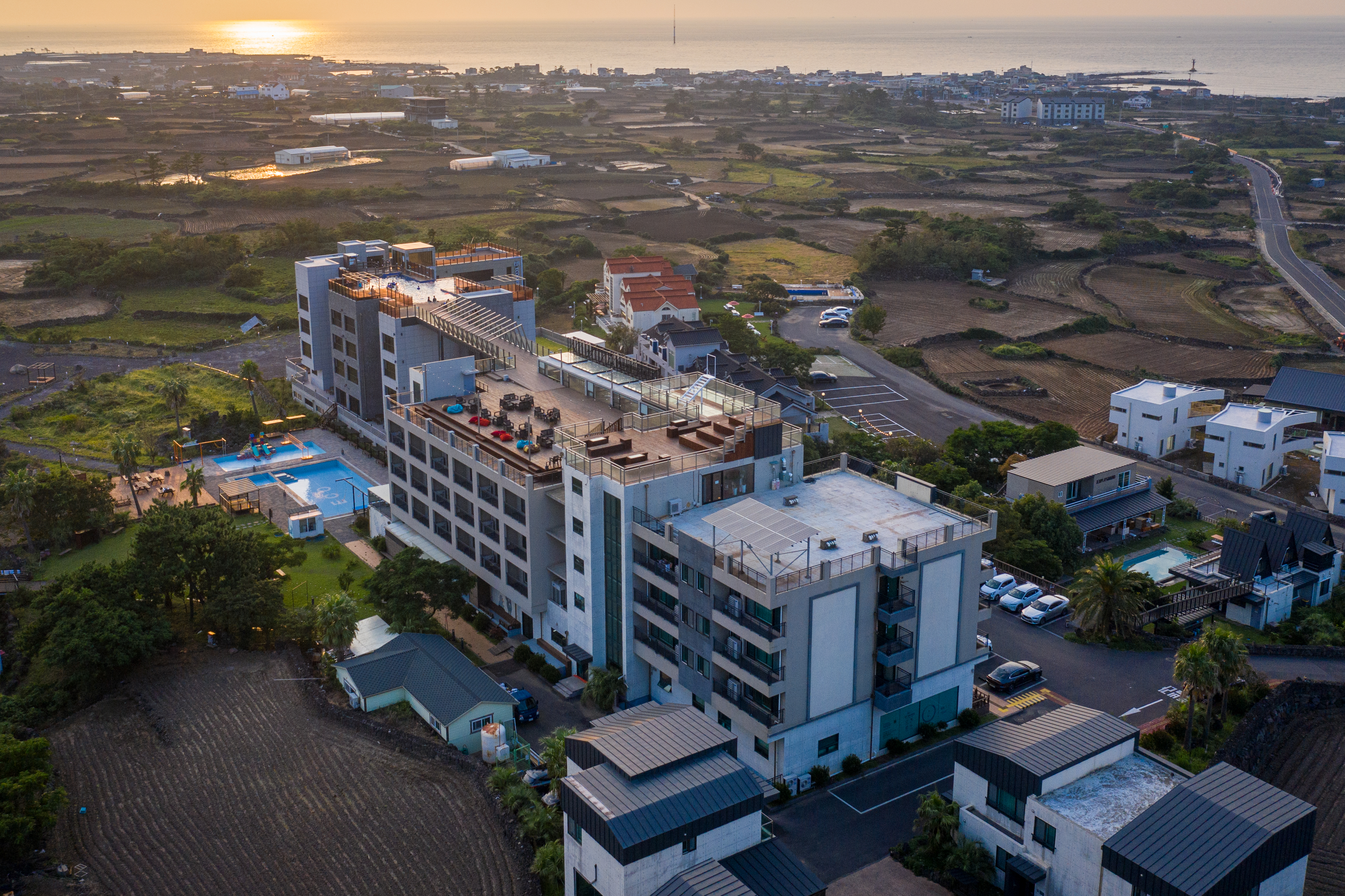 가성비좋고 낮과 밤이 서로 다른 매력을 가진 예쁜 리조트예요~~ 침구도 깨끗하고 청소도 깔끔하게 되어있어서 들어갈때부터 기분좋은 곳이예요~ 침대방이랑 온돌방있는 투룸에 작은 거실겸 주방있어서 답답하지않고 무엇보다 방에서 보는 풍경이 너무 예뻐서 더욱 마음에드는 숙소였어요~~ 1층에도 수영장이 있고 건물위에 루프탑에도 수영장이 있어서 아이들과 오고가면서 재미있거 놀았어요~~ 조식도 맛있어서 숙소에 묵는동안 아침은 모두 조식뷔페로 해결했네요~ 마지막날 저녁은 미리 바베큐신청해서 1층 수영장 옆에있는 바베큐장에서 맛있게 고기 구워먹었어요~ 저녁에 노을지기시작하면 풍경이 너무 아름다워 역시 제주는 너무 예쁘다고 감탄하며 즐거운 추억 많이 쌓은 리조트입니다~
