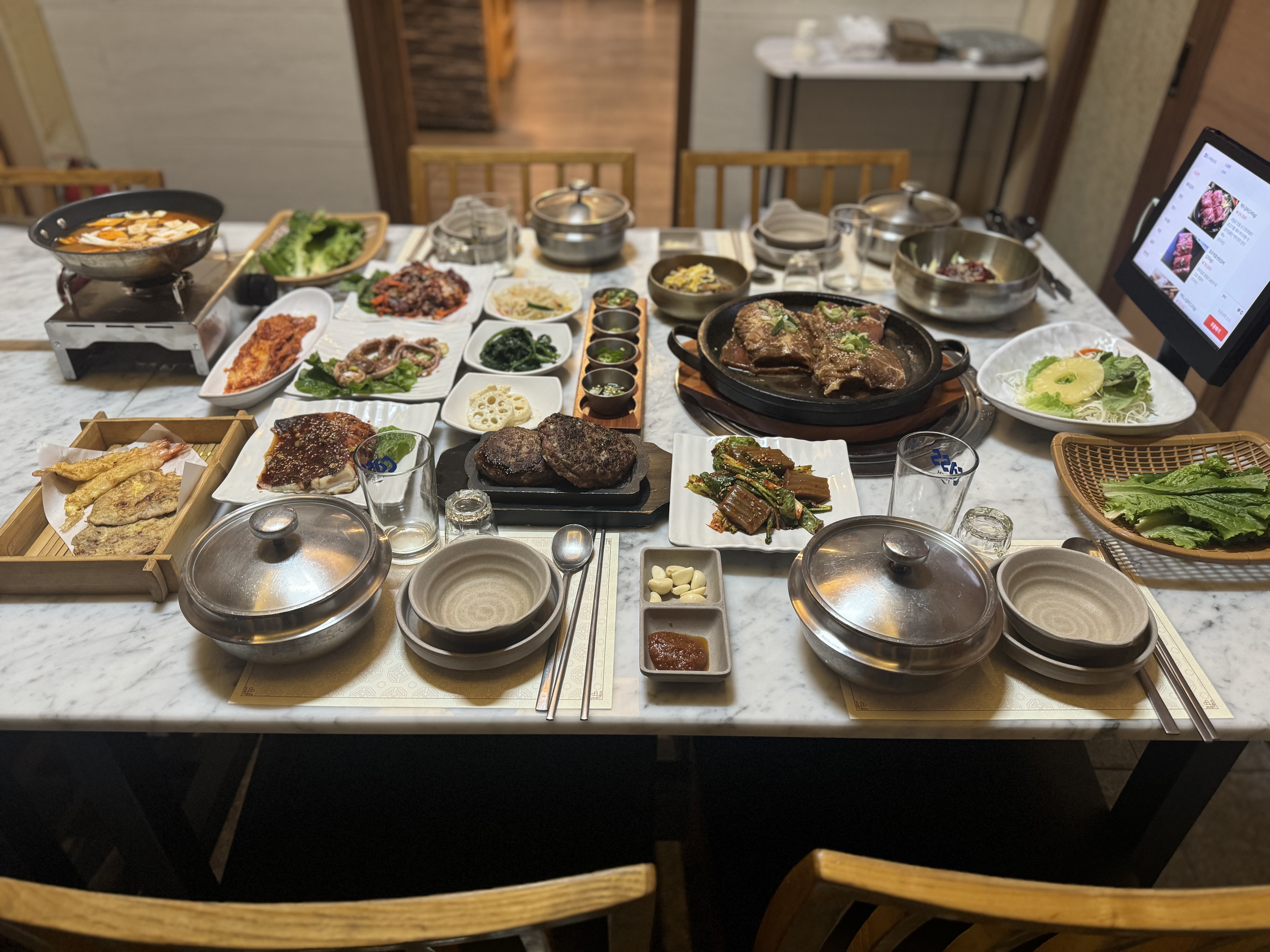 여행특기자목포에 왔으니 그래도 전라도 한정식 한 번은 먹어봐야겠지. 그래서 찾아간 곳이 바로 갈비한정식 백두천지다. 식당 앞에는 넓은 전용 주차장이 있어 주차는 아주 편했다. 내부는 깔끔하고 좌석 간 간격도 넓었으며, 룸도 따로 있지만 사전 예약이 필요하고 일정 인원 이상만 이용 가능하다. 대표 메뉴인 백두소갈비 한정식은 무려 17가지 반찬과 솥밥이 포함된 한상차림이다. 상 위를 가득 메운 반찬들은 보는 것만으로도 군침이 돌았다. 양념게장, 탕수육, 생선조림, 육전, 샐러드까지 — 다양하게 구성되어 있었다. 특히 같이 나온 소고기 육회가 들어간 물회가 고기의 느낌함을 잡아주고 시원해서 좋았다. 국물은 된장찌개가 나왔는데, 구수한 맛이 소갈비와 솥밥과 아주 잘 어울렸다. 메인인 양념 소갈비는 은은한 단맛이 감돌며 육질이 부드럽고 촉촉했다. 고기 양도 넉넉했고, 솥밥은 살짝 눌러붙어 누룽지까지 고소하게 즐길 수 있었다. 반찬 하나하나 정성스러웠지만, 구성면에서는 살짝 아쉬운 부분도 있었다. 그래도 전반적으로 맛, 분위기, 서비스 삼박자가 잘 맞는 만족스러운 식사였다.