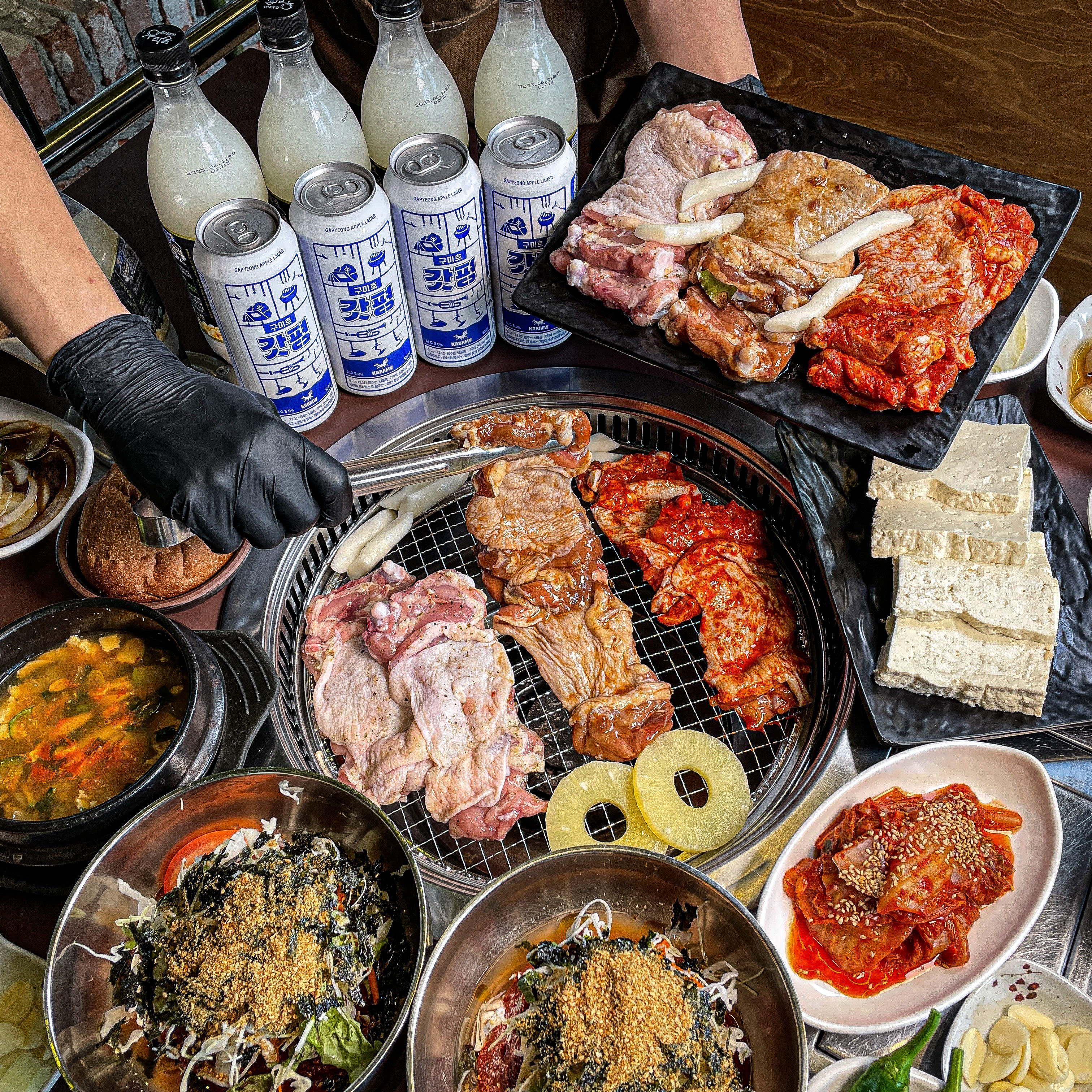 기록자내돈내산 가평 소문난닭갈비 급하게 검색하여 찾아낸 가평 맛집이었다. 아침고요수목원 오색별빛정원전 구경하고 저녁 7시 아침고요수목원 안에 있는 굿모닝 카페에서 몸을 녹이며 인터넷 검색 통해 알아낸 가평닭갈비맛집! 자차를 이용하면 아침고요수목원에서 소문난닭갈비까지 4분 걸린다고 네이버 네비에 나와있고 수목원 주차장에서 정말 가까웠다. 닭갈비를 치즈에 찍어 먹는 방식으로 유명한 특히~ 고추장 닭갈비에 찍어 먹으면 간단했지만 맛을 몇 배를 증가시켜주었다. 식당 건물 옆 공터 주차장은 상당히 넓었다. 2025년 12월 24일 저녁 7시 30분경, 평일 크리스마스이브 저녁 매우 한가했다. 입구 매장에서 바로 굽는 방식 선택해야 하고 숯불/철판 닭갈비 메뉴 선택에 따라 테이블 자리가 달라진다. 우리는 숯불닭갈비 선택했으며 식당 안쪽 테이블 안내를 받아 이동했다. 입구에서 가까운 넓은 홀 테이블이 철판닭갈비 공간이었으며, 아치형 문을 지나 안쪽이 숯불닭갈비 테이블 자리였다. 숯불닭갈비 테이블 공간은 고급스러움 느껴졌다. 숯불 2인 세트 주문 숯불 2인 세트 56,000원 닭갈비 2인분(고추장 1+간장 0.5+소금 0.5)+ 막국수(들) 1 +퐁듀 치즈 1+잣 두부볶음김치 (세트메뉴 변경 불가함) 성인 둘이 먹으면 숯불 2인 세트 충분하지만 닭갈비가 조금 부족한 느낌이 들어 고추장 닭갈비 추가했더니 엄청나게 배부르다. 주문을 하고 셀프 코너를 구경하러 갔다. 숯불과 철판 나눠지는 매장 중앙에 셀프 코너가 영역을 명확하게 나눠주고 있었다. 다양한 야채와 소스 등이 뚜껑이 닫힌 위생적인 상태로 담겨 있어 좋았으며 리뷰를 통해 4천 원 아이스크림을 공짜 득템하여 먹을 수 있고, 가평엿과 가평잣 두부과자도 판매 중이었다. 셀프바 찍다가 배달 로봇이 지나가는 모습 보고 우리 주문한 메뉴라 뒤를 졸졸~ 따라갔더니 또한, 직원분도 배달 로봇 뒤를 따라오셨다. 배달은 로봇이 하고, 직원분이 세팅은 마무리해 주신다. 기본 세팅 반찬, 셀프바 이용하지 않아도 충분히 제공해 주신다. 잣두부 볶음김치 가평잣두부! 세트에 포함되어 있으며 두부에 잣이 쏙~ 박혀있고 맛은 일반 두부와 크게 차이가 나지 않았지만 두부 자체가 고소하니 맛있었다. 닭갈비를 숯불에 올려놓고 닭갈비가 익기 전, 먼저 먹으면 된다. 숯불닭갈비 맛있게 굽는 법 닭갈비 2인분(고추장 1+간장 0.5+소금 0.5) 모두 불판에 올려구워준다. 가이드에 최소 4쪽을 올려주라고 나와있으며 직원분이 오셔서 고기를 올려주신다. 양념된 닭갈비는 타지...