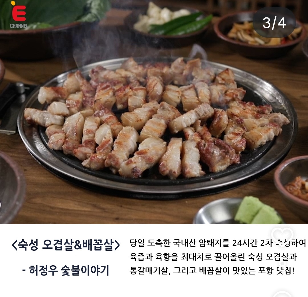 찡찡효도르경주에서 포항으로 넘어온 첫날 - 숙소에 모든 짐을 풀어놓고, 잠시 정리하면서 식사할 곳을 찾아보기로 했다. 다음날은 대게&회, 그리고 죽도시장을 갈 예정이라 오늘은 근처에서 간단하게 식사를 했으면 해서 주변 10분이내의 맛집을 찾아보는데 그 중에서 제일 눈에 들어왔던 곳이 #허정우숯불이야기 였다. 맛집을 찾은 친구는 곧바로 우리에게 공유해주었는데 나중에 알고보니 #하정우숯불이야기 인줄알고(?) 하정우가 바쁜데 식당도 냈구나 라고 생각했단다 아놔 ㅋㅋㅋㅋㅋㅋㅋㅋㅋ 여튼 우리 숙소는 #포항고속터미널 근처 #포항월드하우스 였고, 도보로 가능한 거리! 점심을 스타벅스에서 빵과 음료만 먹은 상태라 부지런히 저녁을 먹으러 가기로 했다. 허정우숯불이야기 2025년 8월 4일 월요일 ✔️영업시간 : 월 ~ 토 16:00 ~23:00 (21:30 라스트오더) ✔️매달 1,2,3,5번째 일요일 정기휴무 폭염, 폭우가 걱정되었던 날씨였는데 저녁식사를 하러 나가는 시간에는 잠시 비가 내렸고, 우산을 쓰기에는 애매하고, 안쓰기에는 조금 많이 내리는 듯한 비가 내렸다. 총 인원이 8명! 아이들과 함께 부지런히 걸어서 도착한 #허정우숯불이야기 매장안으로 들어가보니 다행히 맨안쪽에 8인석이 방금전 식사를 마치고 나가셔서 치우고 나면 바로 앉을 수 있다고 안내해주셨다. 나중에보니 테이블링이 따로 있었던것 같은데 우리가 방문했을때는 운이 좋게 대기가 없었나보다. 그리고 대기석도 따로 있다고 했는데, 아마도 우리는 바로 앉을 수 있었기에 잠시 기다리라고 해주셨던듯 - 기다리면서 메뉴판을 잠시 둘러보았고, #허정우숯불이야기 의 메인메뉴는 배꼽살과 한정판갈매기살, 그리고 껍데기가 맛이 있나보다. 오래 기다리지 않고 바로 자리 안내를 받았고, 앉으면서 곧바로 주문을 하였다. 반찬 종류도 다양하고, 오이무침이 입안을 개운하게 해주며 맛있었다. 껍데기에는 콩가루와 소스까지 넉넉히 주셨고, 아이들도 너무 잘 먹은 메뉴중에 하나였다. 적당히 익은 것을 좋아하는 나, 빠싹익힌것을 좋아하는 친구, 껍데기 안좋아하는 친구 정말 입맛 다 다른 친구 세명이서 모여서 참 잘먹고 잘 다니는것 같다 ㅋㅋㅋㅋㅋㅋ 칼집오겹살은 150g 에 13,500원 가격이 너무 좋았고 궁금하니까 배꼽살도 하나 주문해보았다. 역시나 껍데기 안먹는 친구 입맛에는 별로, 껍데기 바싹 익혀먹는 친구는 soso, 껍데기 적당히 익힌것을 좋아하는 나는 맛있네? ㅋㅋㅋㅋㅋㅋㅋ 모든 음식은 개인적인 입맛에 따라 맛집이다 아니다가...