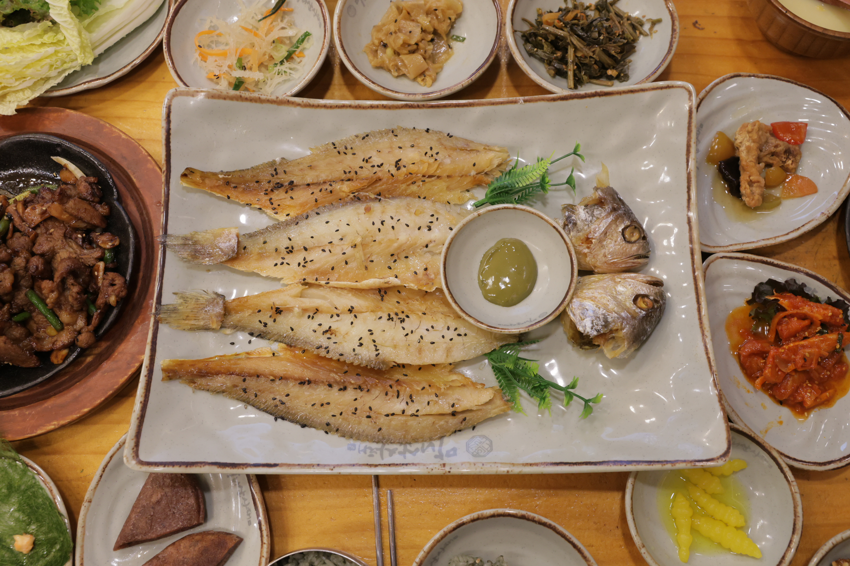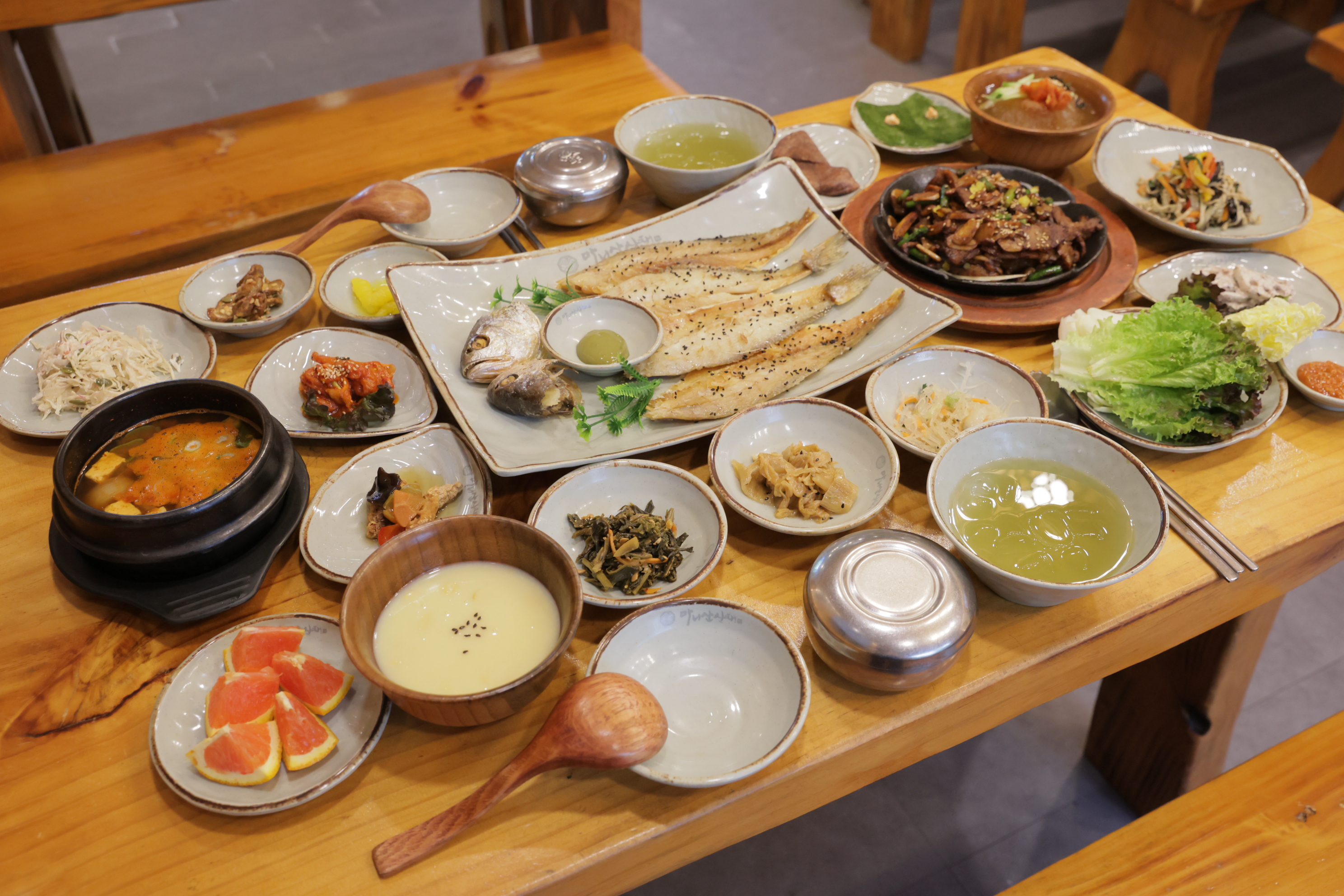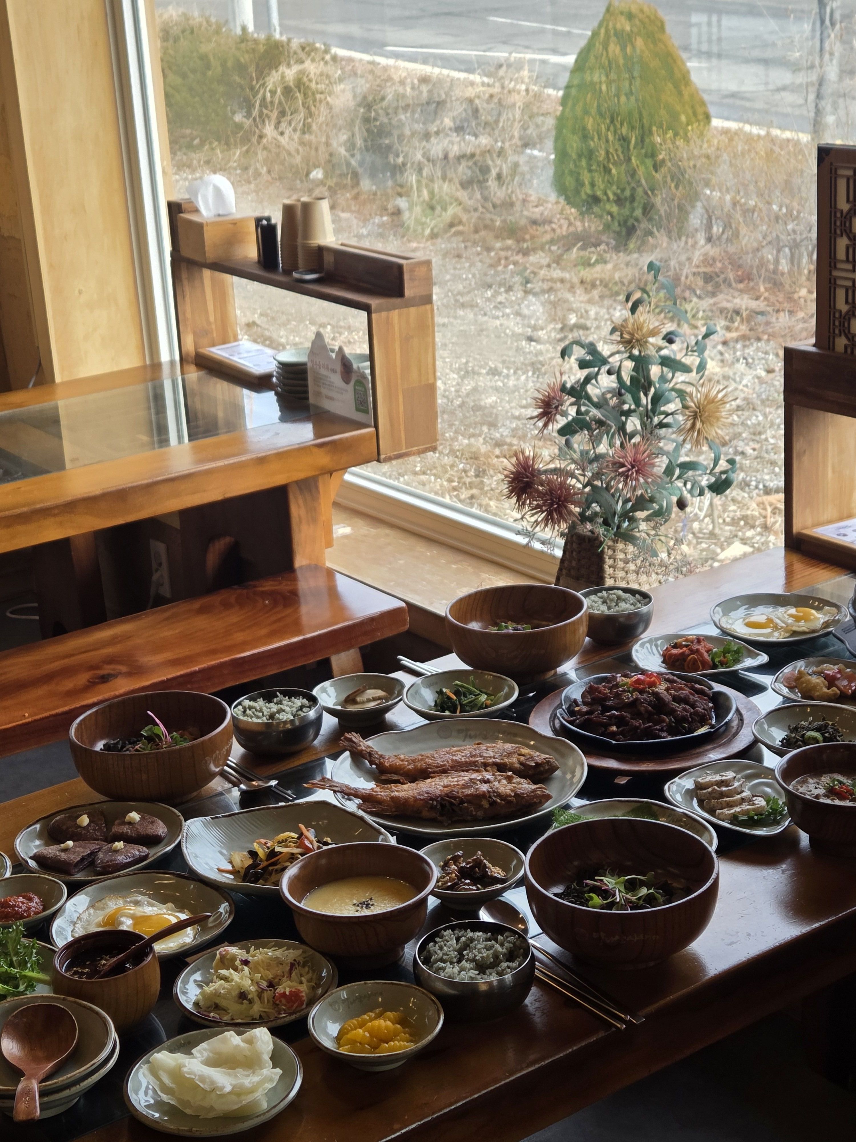 지동일산 가족모임 추천하는 마니산산채 한정식 코스 안녕하심니카. 오늘은 며칠 전에 엄빠 모시고 다녀온 한정식집 후기~ 엄마가 너무 가 보고 싶어 했던 곳이었는데 이번에 다녀오게 되었어요 평소에도 고기보다 채소를 더 좋아하셔서ㅋㅋ (고기는 다 내거.) 제가 이번에 일산 가족모임으로 다녀온 곳은 마니산산채 영업 정보 11:00 - 21:00 라스트오더 20:00 주말 브레이크 타임 15:30 - 17:00 주차 가능 ☎ 0507-1385-8712 일단 내부를 먼저 보여 드릴게요 조명 덕분인지 엄청 따뜻한 느낌! 그리고 한정식집 답게 뭔가 전통 가옥의 어떠한 그런 느낌이 있었어요 ㅋㅋㅋ 평일 점심 때 갔는데 단체 손님이 정말 많더라구요 일산 가족모임 뿐만 아니라 단체 회식으로도 많이 오시는 듯! 외국인 손님 모시고 접대하는 테이블도 있었어요 일산 가족모임 마니산산채 샐러드바 그리고 가지수가 많지는 않지만 샐러드바가 있어서 정말 좋았습니당. 채소 킬러인 엄마는 채소를 왕창 퍼 와서 드셨구요 아빠는 계란 후라이 먹을 수 있다고 좋아했고 저는 아이스크림!!!!이 있어서 너무 좋 았 어 용 !!! 일산 가족모임 마니산산채 메뉴판 이제 메뉴를 보여 드리겠습니닷 오른쪽으로 넘기면서 보시면 되고요 저희는 세 명이서 방문했는데 각각 주문해도 된다고 해서 환웅 2인분, 마니산 1인분 이렇게 주문했어요 전체적인 상차림은 이렇게 나오구요 메인 메뉴로는 직화 고추장 불고기와 볼락구이가 나왔습니다 생선은 생각보다 컸는데 1 주문당 1마리씩 나온대요 이렇게 섞어서 주문하니까 다양하게 맛볼 수 있어서 좋았어요 나물에는 밥을 비벼 먹으면 됩니다 정말 맛있게 먹었던 고추장 불고기! 약간 제육 느낌으로 ㅎㅎㅎ 마지막 한 점까지 싹싹 긁어서 먹었어요 그리고 제가 생선을 안 좋아해서 큰 기대는 없었는데 생각보다 가시 바르기도 쉽고 고소해서 잘 먹고 온 볼락구이까지 그 외에도 되게 많은 요리들이 나왔는데 된장찌개는 맛이 진해서 엄청 구수했고요 이 수수부꾸미가 엄청 쫀득하고 일품이었슴니다!!!! 두바이 쫀득 쿠키 왜 먹냐 ㅠ 우리한텐 코리아 쫀득 수수부꾸미가 있다...... 처음 먹어 보는 맛이라 신기했던 순옥수수미음과 버섯들깨탕 옥수수미음은 약간 스프 같아서 제가 엄청 잘 먹었어요 ㅎㅎㅎ 버섯들깨탕은 엄마 아빠가 잘 드심 이렇게 호불호가 달라도 밑반찬 가짓수가 많으니 일산 가족모임으로 추천드립니당 계란은 반숙으로 잘 후라이해서 제 밥 위에 얹어 줬구요 같이 나온 달래장을 뿌려서 아주 제대로 먹었습니다 역시 비빔밥에는...