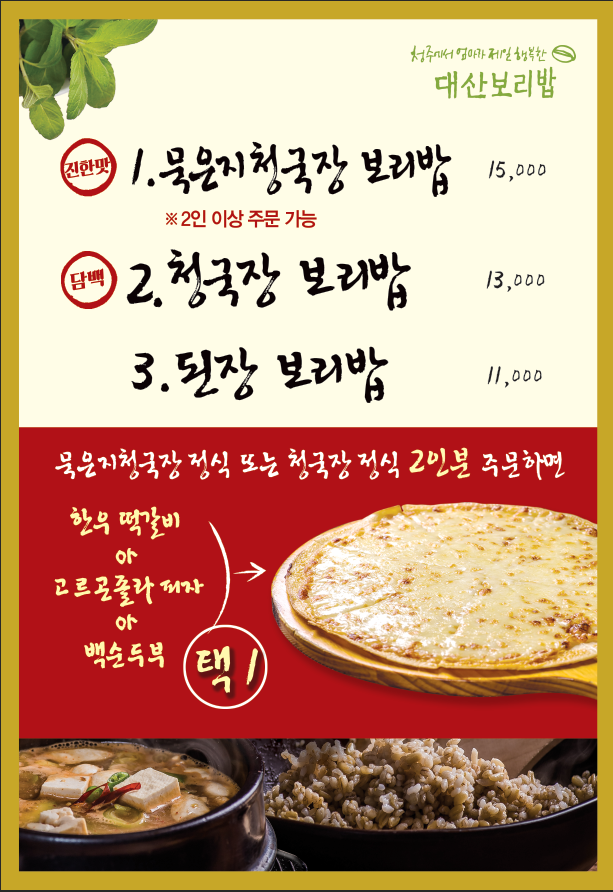타블라세미한정식스러운 대산보리밥 청주 보리밥 보리밥 청주에는 유독 보리밥집이 많은데 그 원조인 청주대산보리밥 청주대산보리밥 청국장 또는 묵은지청국장 주문시 한우떡갈비 또는 피자 서비스 제공 오전 10시 50분 오픈하고 수 목 이틀간 휴무 5전 6기의 신화 수업료를 많이 치루었다 ㅎㅎㅎ 식당 도처에 적절한 스토리텔링 배치 우리 일행 6인은 묵은지청국장 주문 그리고 서비스 사이드로 한우떡갈비 2개와 피자 1개 주문 묵은지청국장 1만 5000원 청주 보리밥 사이드 메뉴로도 별도로 판매한다 여러명이 방문하면 아마 별도로 많이 주문할 메뉴는 들기름두부구이 또한 9000원 짜리를 2인분 기준으로 하나 제공한다는 암시도..... 기본 차림 언제나 반가운 잡채 보리밥용 채소 수육도 반찬에 들어간다 적당히 잘 삶았다 묵은지청국장 1인분 1만 5000원 서비스 한우떡갈비 2피스로 제공 이런 떡갈비는 사이드 메뉴로 구성할 때 그 위력을 발휘한다 고르곤졸라 피자 이것도 서비스 메뉴 피자는 전문점의 맛 꿀에 찍어서 드실 것 채소를 보리밥에 담는다 그리고 이 식당의 시그니처인 약고추장을 넣는다 보리밥위에 채소 그리고 약고추장 방앗간에서 직접 짠 참기름..... 청주 보리밥 듬뿍 뿌린다 참기름 양이 유독 고소하다 보리밥과 채소 나물과 약고추장과 참기름 밸런스가 좋다 슬슬 편안하게 넘어가는 맛 청주 보리밥 청주 압도적 1등 보리밥집답게 맛의 균형점이 좋다 구수하고 진한 묵은지청국장 웰빙형의 완성 청국장 역시 묵은지와 찰떡 궁합 보리밥도 먹고 청국장도 먹고 수육과 떡갈비 등도 같이 먹을 수 있는 세미한정식스러운 구성 고추장도 약고추장에 찍어서 드신다 보리강점 디저트 식당 예비창업자 올해는 오픈하겠지 ㅎㅎㅎㅎ 청주 보리잡 날씨가 추워도 미숫가루는 꼭 드시기를