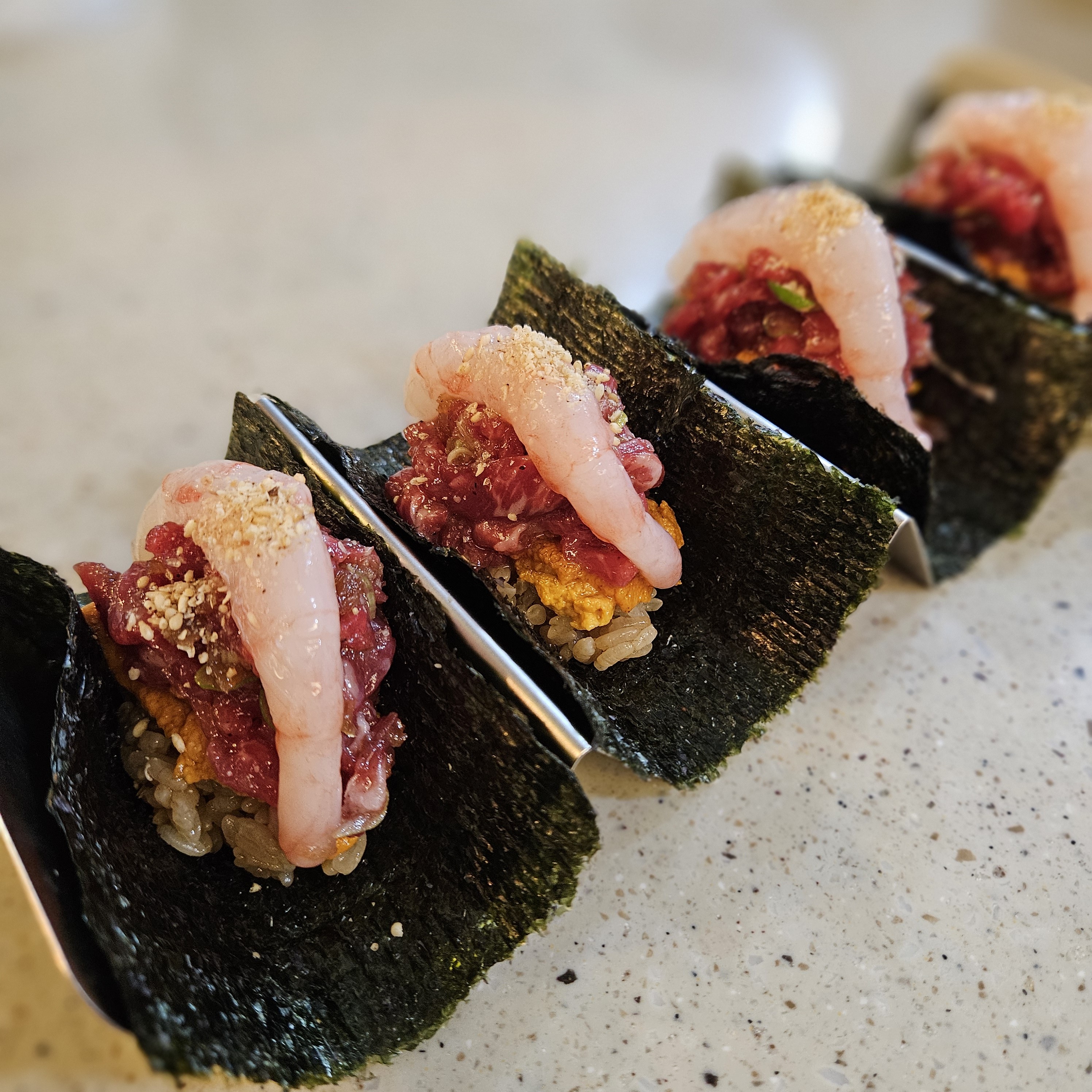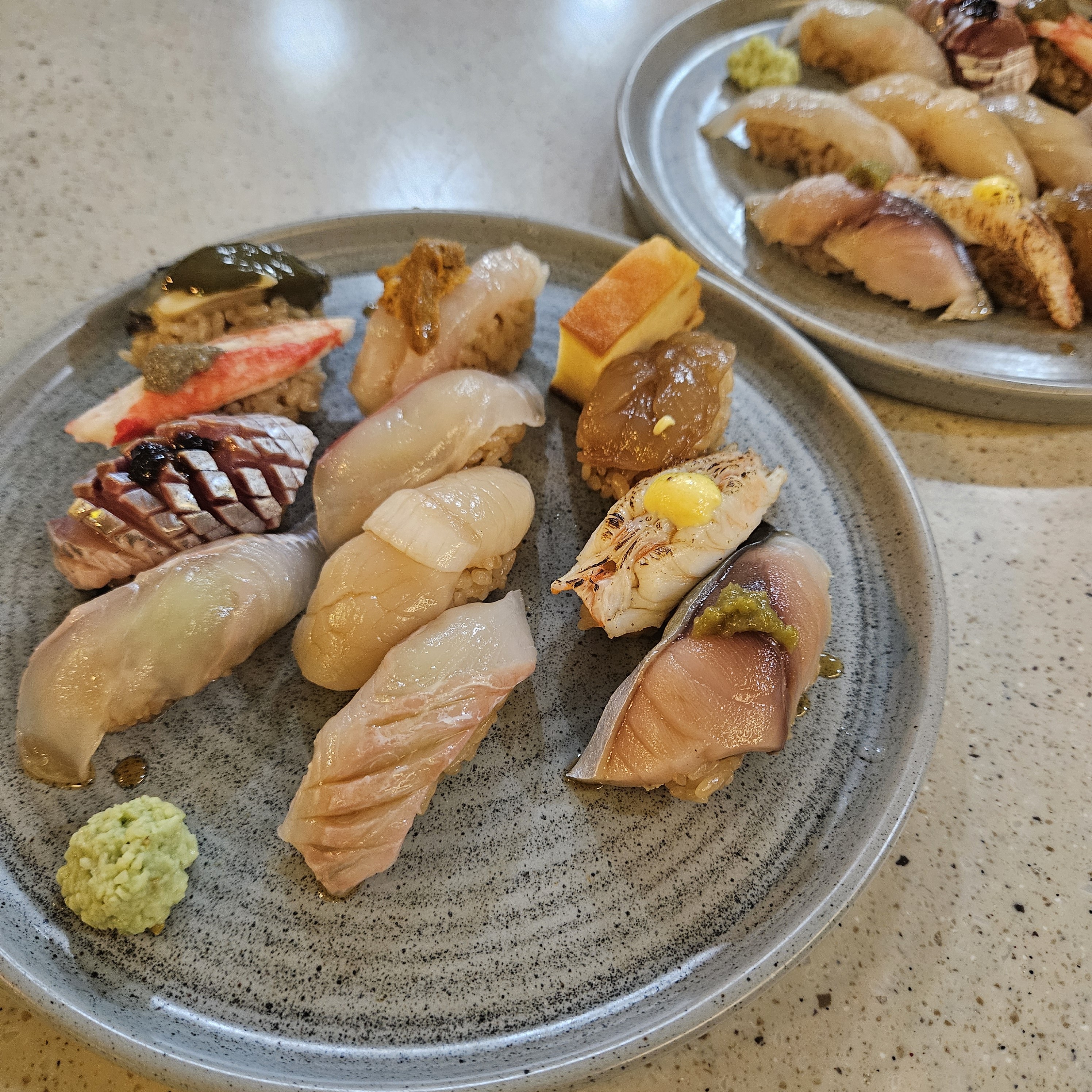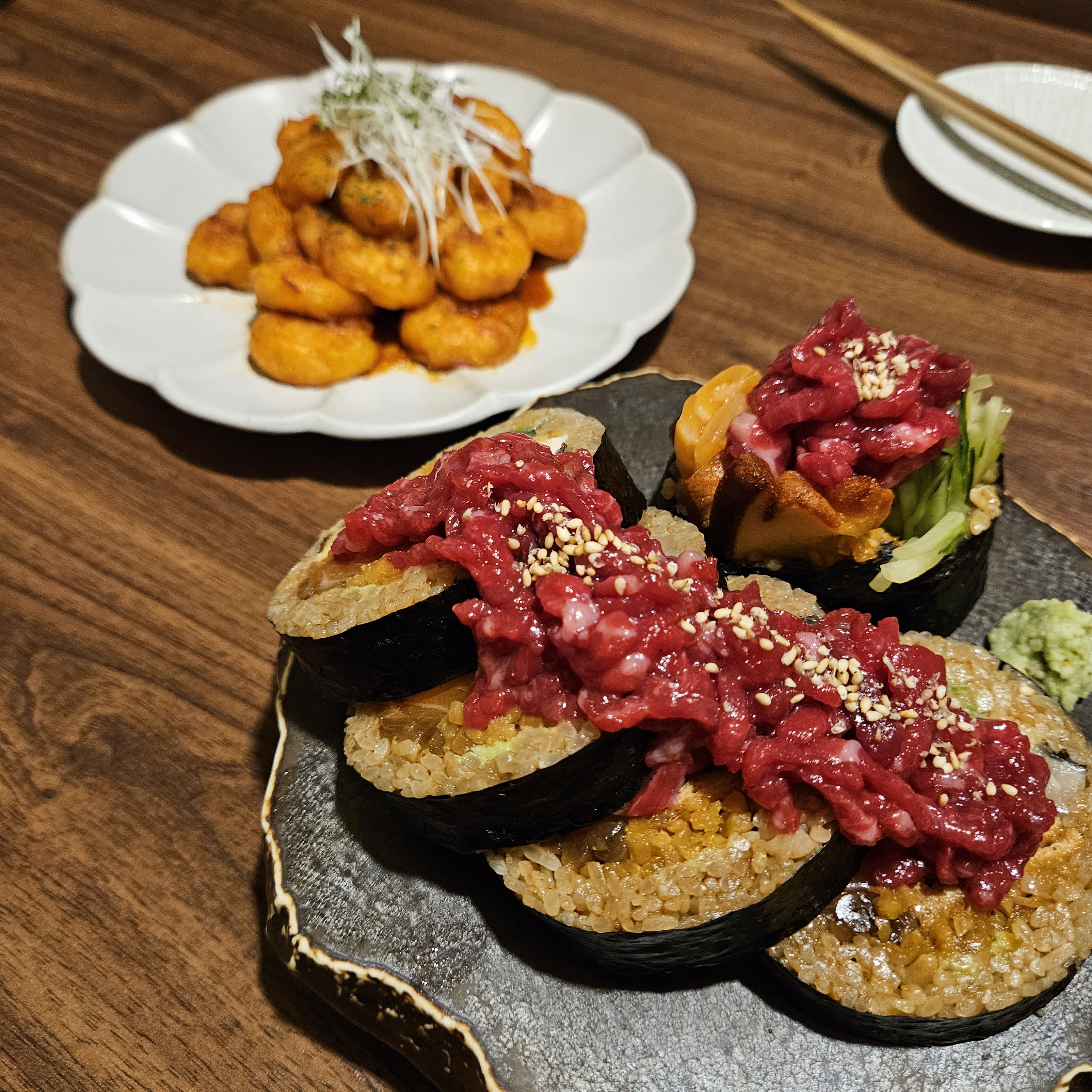 AQWAZ맛있게 잘 먹었어요 초밥 파는곳을 가면 항상 특색있는 메뉴가 있는지 확인하는데 이곳은 철에 따라 여러 생선을 제공하는거같더라구요. 우니육회마키에 고로케도 맛있고 바질소스(?)를 곁들인 토마토 크림치즈도 정말 맛있었어요 가격대가 일반 초밥집 생각하면 좀 높다고 느낄 수 있지만 그만큼의 값어치는 제공하는듯합니다.
