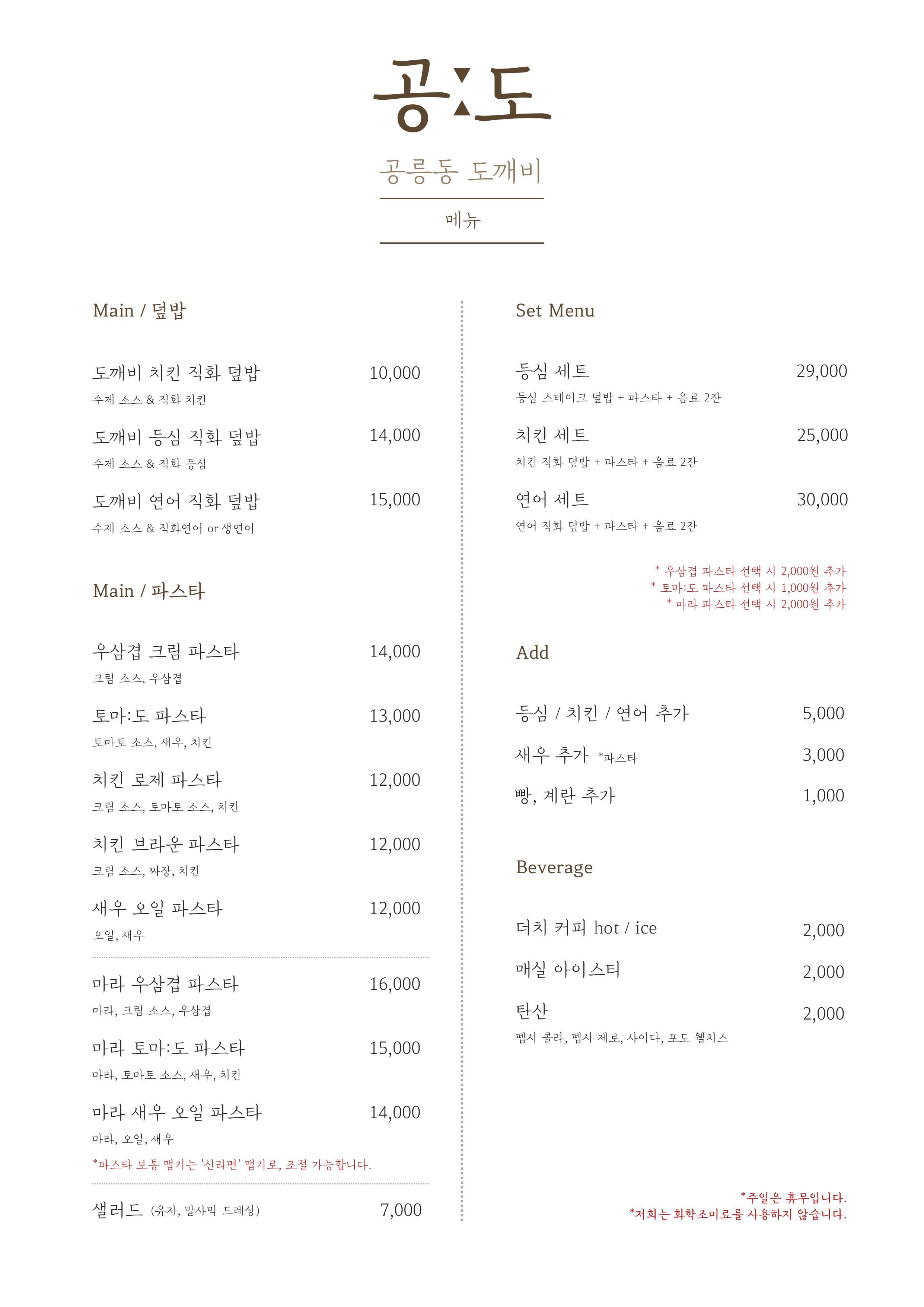 - 파스타 전 메뉴 **맵기 조절 가능* 0원
