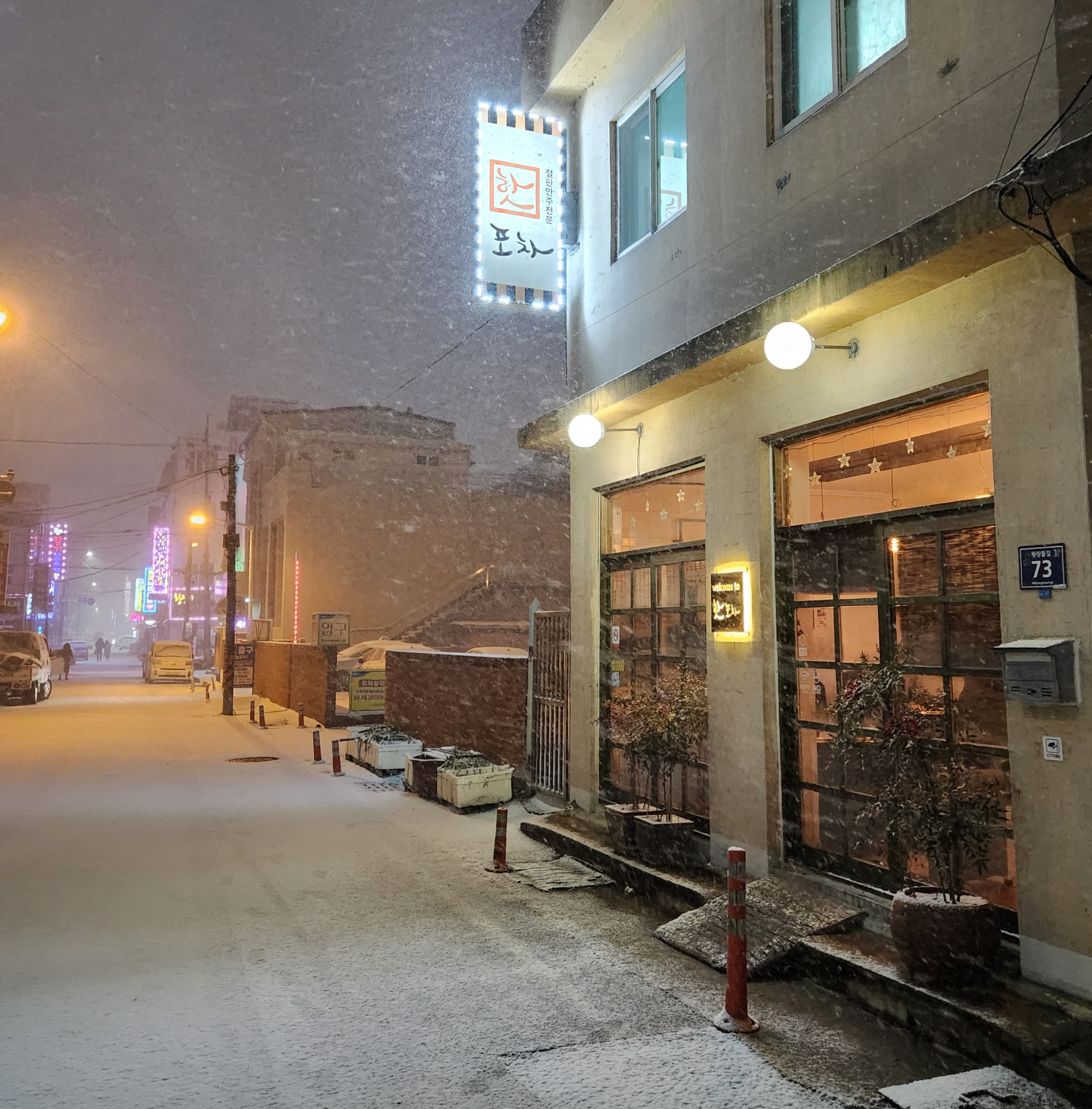 초코맘증평 골목 핫한 술집 핫포차 방문 후기 여기는 주말(토, 일)이 휴무라 특이하다고 생각한 곳이었는데 갑자기 근처 왔다가 생각나서 방문했다. 위치는 증평 지구대 뒷편 골목 유동 인구가 많은 쪽은 아닌 것 같은데 항상 보면 사람이 꽉 차 있다. 밤 되어 불 켜지니 더 감성적인 느낌이다. 메뉴 대표 메뉴는 철판요리, 감자채전인 것 같다. 메뉴는 치즈낙지, 오징어, 고추장불고기 철판 핫칠리새우, 똥집, 골뱅이소면, 계란말이, 먹태, 버터오징어 해물파전, 통새우부추전, 치즈감자채전, 어묵탕, 라면 등 술 가격은 4천원 물, 술 셀프 맘대로 꺼내 먹어서 좋다. 놀라운 토요일 223회에 핫포차의 오징어철판, 치즈감자채전, 골뱅이소면이 나왔다. 방송으로 봤었는데 신기하네 담요, 물티슈, 휴지도 가져다 쓸 수 있게 준비되어 있다. 요구하지 않아도 되니 오히려 편했다. 원형 테이블이 4개 있는 아담한 실내 포장마차 느낌이었다. 어두워지니까 더 분위기 있다. 물, 술은 셀프인데 토닉워터랑 무알콜 맥주도 있어서 술 안 좋아하는 사람들이 분위기 즐기기도 좋을 것 같다. 기본 안주는 단무지 무침, 양배추샐러드 그리고 철판 요리를 시키면 계란프라이를 주신다. 음식 나오는 속도는 조금 느린 편이었다. 치즈 낙지철판(26,000) 낙지가 오동통하고 치즈가 꼬소했다. 치즈 진짜 맛도리 볶음밥 먹으면 죽음일 듯 가격에 비해 양은 조금 적은 편,, 다 먹어갈 때 쯤에 과일을 주셨다. 깨알 토끼 사과,, 귀여웡 메뉴 사진 보니까 칠리새우나 똥집도 맛있어 보이던데 치즈감자채전 먹으러 다시 와야겠다,, 분위기 너무 좋았던 핫포차 추천~! 월~금 18:00~23:00