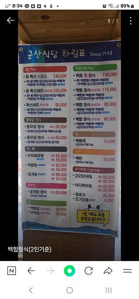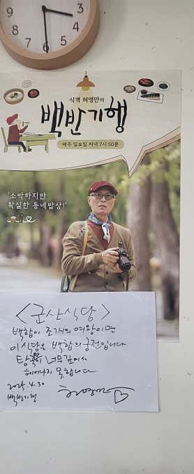 민씽부안 변산 채석강 현지인 추천 맛집 [군산식당] 백합정식 맛있어요! (ft. 식객 허영만의 백반기행도 다녀감) 2025.10.23.(목) 순천만 국가정원을 구경하고 열심히 달려 도착한 변산반도 2시간이 훌쩍 넘는 거리라 붉게 노을 지는 모습을 달리는 고속도로에서 맞이하며, 저녁 7시쯤에야 숙소에 도착할 수 있었다. 체크인만 하고는 바로 저녁 먹으러 출발~ 숙소 사장님께서도 추천한 군산식당으로 고~고~ 마침 숙소에서도 가까워 10여 분 만에 도착한 군산식당 군산식당 주소 : 전북 부안군 변산면 격포항길 16 영업시간 : 08:30~20:00(매일) 브레이크 타임 : 15:00~16:30 전화번호 : 063-583-3234 식객 허영만의 백반기행에서도 다녀갔다고 대문짝만하게 붙어 있었다.(2025.6.1. 방영) 내부 테이블은 제법 많았다. 저녁 식사 시간이 지난 시간이라 더문 더문 자리를 잡고 있었다.(모두 식사를 하고 나간 시간에 찍음) 유명인들이 다녀갔다는 사인이 한 벽면을 가득 메우고 이었다. 다양한 메뉴가 많았지만 우리는 가성비도 좋고 맛도 좋다는 백합정식으로 주문~ 백합탕+백합죽+백합탕+갑오징어무침+우럭찜이 나오는 4인상이 120,000원이었다. 백합의 효능이 대단하구먼! 먼저 동그랗게 밑반찬이 차려지고, 바로 옆에는 맑은 백합탕이 자리했다. 그 가운데 백합죽과 백합찜이 나왔다. 백합찜은 처음에 조그마한 고구마인줄~ㅋㅋㅋ 큰 그릇에 나와 4명이서 앞접시에 나눠 먹기 저녁 늦은 시간이라 고픈 배를 부드러운 백합죽으로 워밍업 하기 좋았다. 그리고 이건 백합찜 호일을 하나씩 벗기면 조개껍질 안에 국물 가득 머금은 백합이 나온다. 국물 쏟지 않게 조심조심 다루어 국물 먼저 호로록 마시고 쫄깃한 백합 먹기 뜨끈한 국물과 함께 먹으니 맛나다.(가끔씩 질긴 것도 있었다.) 그리고 다음으로 나온 갑오징어무침 새콤달콤 양념 버무린 갑오징어무침에 친구들 손놀림이 바빠졌다. 부드럽고 쫄깃한 갑오징어 인기 짱! 마지막으로 나온 우럭찜 양념소스 잘 베이고, 중간에 칼집이 나 있어 생선 살 먹기도 편했다. 현지에서 공수한 싱싱한 백합과 생선들로 만들어졌으니 맛있을 수밖에... 그사이 우동사리 넣은 백합탕도 보글보글 끓어 앞접시에 들어 먹기 백합탕에도 백합이 한가득 들어 있었다. 여러 가지 메뉴가 세트로 들어 있어 맛과 가성비까지 훌륭했던 백합정식이었다.