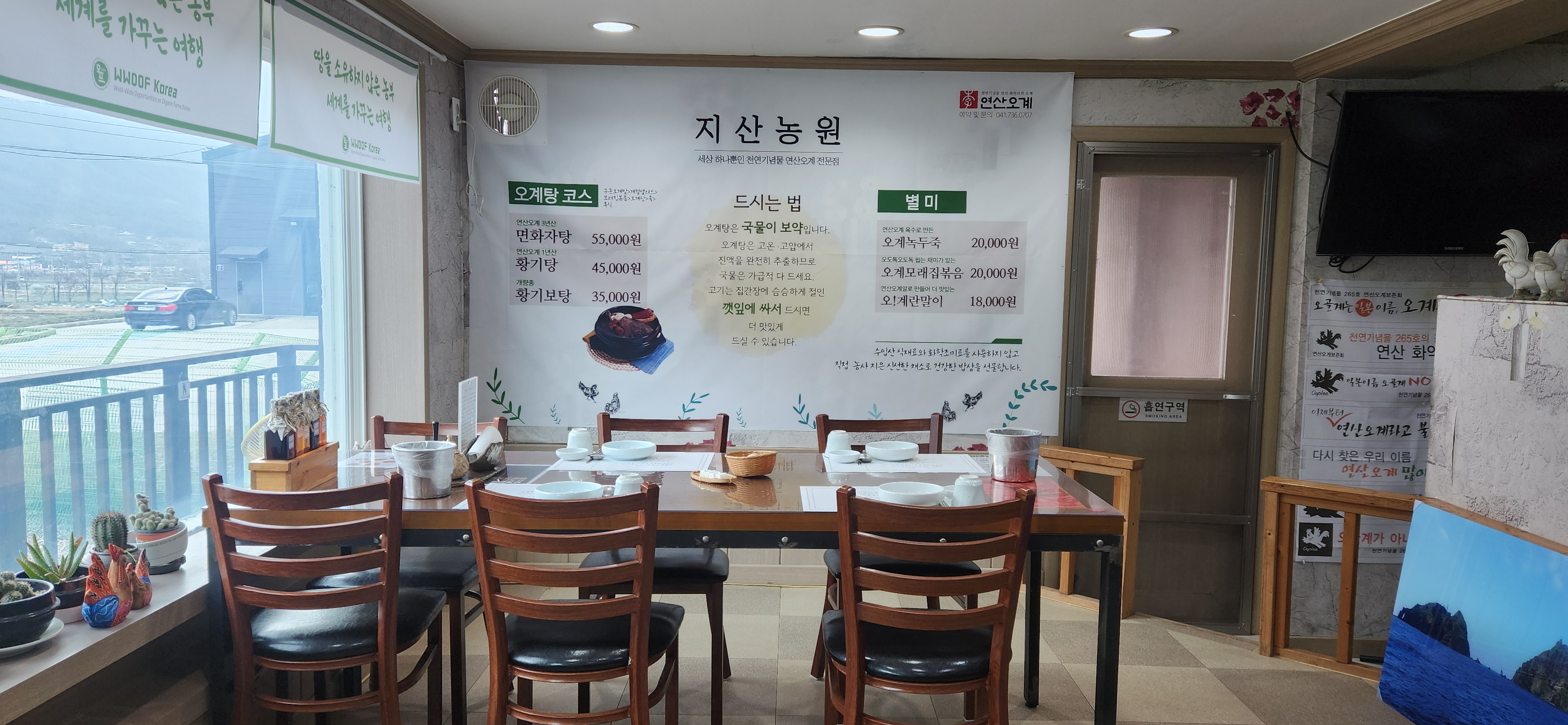 마리안논산 맛집 연산오계 지산농원 황기탕으로 건강충전했어요~ 논산 연산쪽으로 지날 때마다 종종 보였던 지산농원. 연산 오계로 천연기념물로 지정되어 있다고 하는 이야기는 들었었는데요. 직접 가서 맛을 볼 기회는 없어 궁금하던 차에 들렀었어요. 이 지역의 명물로 이미 알고 찾는 분들이 많다고 하는데요. 복날이 찾아오면, 그리고 보양식을 찾는 분들이라면 으레 찾을만한 곳이었어요. 지산농원은 논산 개태사에서 차로 3분, 바로 인근에 위치하고 있고요. 도로변으로 안내판이 있어서 오며가면서 한번쯤은 봤을 곳이에요. 농원이란 이름으로 식당이 있을 거라는 생각은 못할 수도 있는데요. 아는 분들은 다 알고 찾는 곳이라 점심시간을 지나서 왔음에도 주차장에 차들이 꽤 많았어요. 이미 이곳의 이야기는 듣긴 했었는데요. 흘려들어서 어떤 곳일지 상상을 못했는데 막상 들어와 보니 농장의 규모가 꽤 컸어요. 오계라고 하면 오골계를 말하는 건가 싶을 텐데요. 엄밀하게 말하면 다르다고 해요. 천연기념물 265호인 연산 화악리 오계는 국가지정 사육인인 지산농원 대표는 오골계는 원래 흰 깃털로 덮여 있지만 뼈가 까만 일본오골계를 지칭하는 이름이라고 하고요. 깃털은 물론이고 뼈와 피부 눈, 발톱까지 전체가 새까만 한국의 검은 닭은 "오계"가 맞다고 해요. 2008년 문화재청 고시로 명칭이 변경 확정됐다고 합니다. 1980년 천연기념물 265호로 지정돼 보호되고 있는 국내 유일의 "연산 화악리 오계"를 사육하고 있는 곳인데요. 한때 멸종위기에 있던 토종 오계의 혈통보존과 종계 선발 등의 역할을 하고 있는 농원으로 종계 보존을 위해 방목 형태로 사육하고 있다는데요. 이 가운데 표준체형을 가진 종계가 아닌 오계나 임무를 마친 퇴역 종계들, 오계 알을 식용으로 제공하고 있다고 합니다. 혈통을 이어가고 있는 곳인만큼 살아있는 오계는 외부로 분양되거나 판매하지 않는다고 하네요. 가까이서 보고 싶어서 오계를 따라다녔는데요. 우리 안에서 지들끼리 노느라고 오지 않더라구요. 연산오계의 가장 큰 특징은 일단 검다는 것이겠죠. 온통 검긴 하더라고요. 외형적 특징을 적어 둔 글을 보니 오계의 볏은 왕관형으고 검붉은 색을 띠고 있데요. 암컷 볏은 수컷보다 훨씬 작고 모양은 수컷과 같고요. 깃털은 청자색이 감도는 흑색이고 가끔 흰색이나 얼룩무늬 깃털을 갖고 나오기도 한다는데요. 일종의 돌연변이 같은 흰오계가 2천마리당 1마리꼴로 나오기도 하고요. 오계 조형물 너무 귀엽지요. 순종 오계를 고를 때 알아둘 점. 바로 발가락...